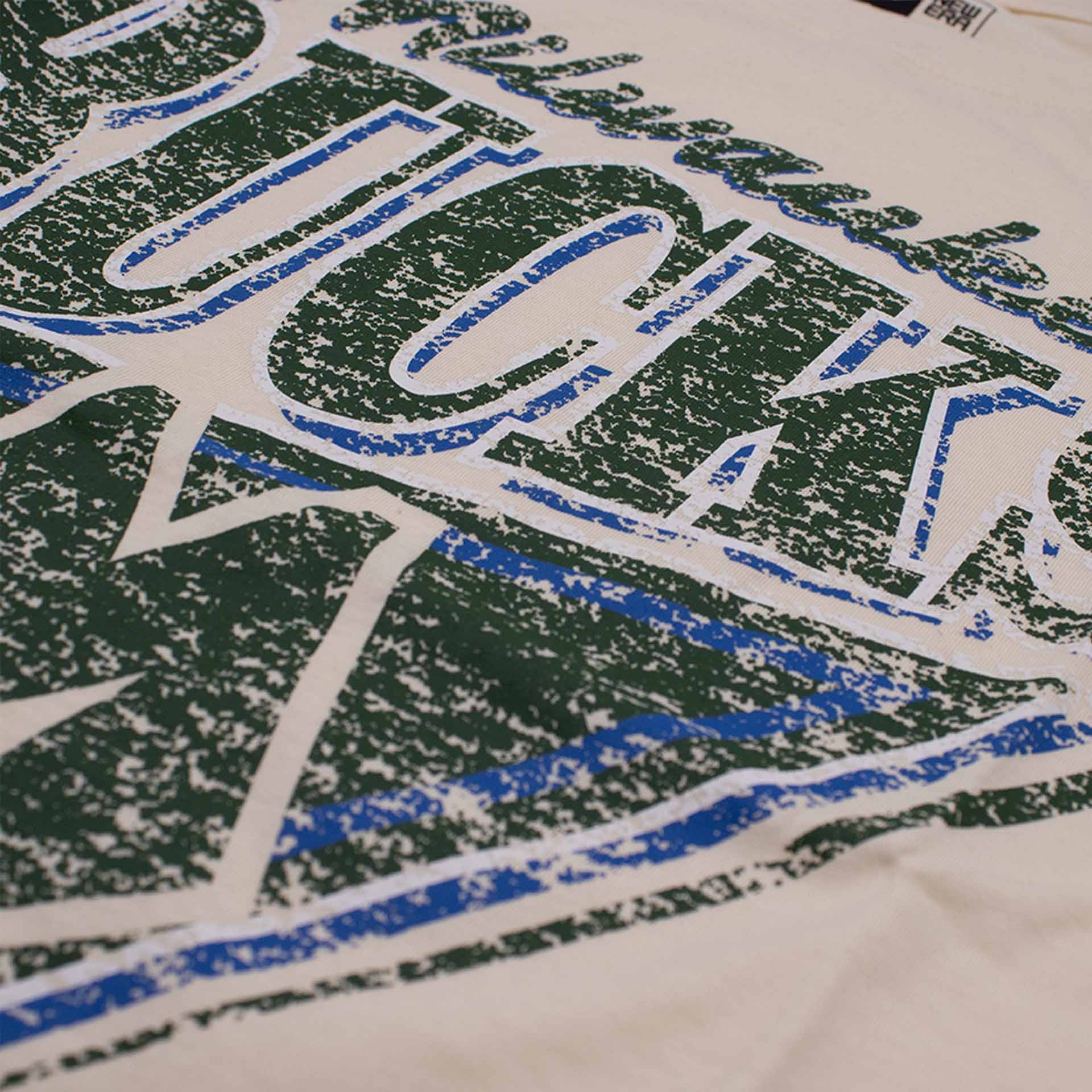 - Large vintage-style front print with classic Milwaukee Bucks lettering and basketball graphic