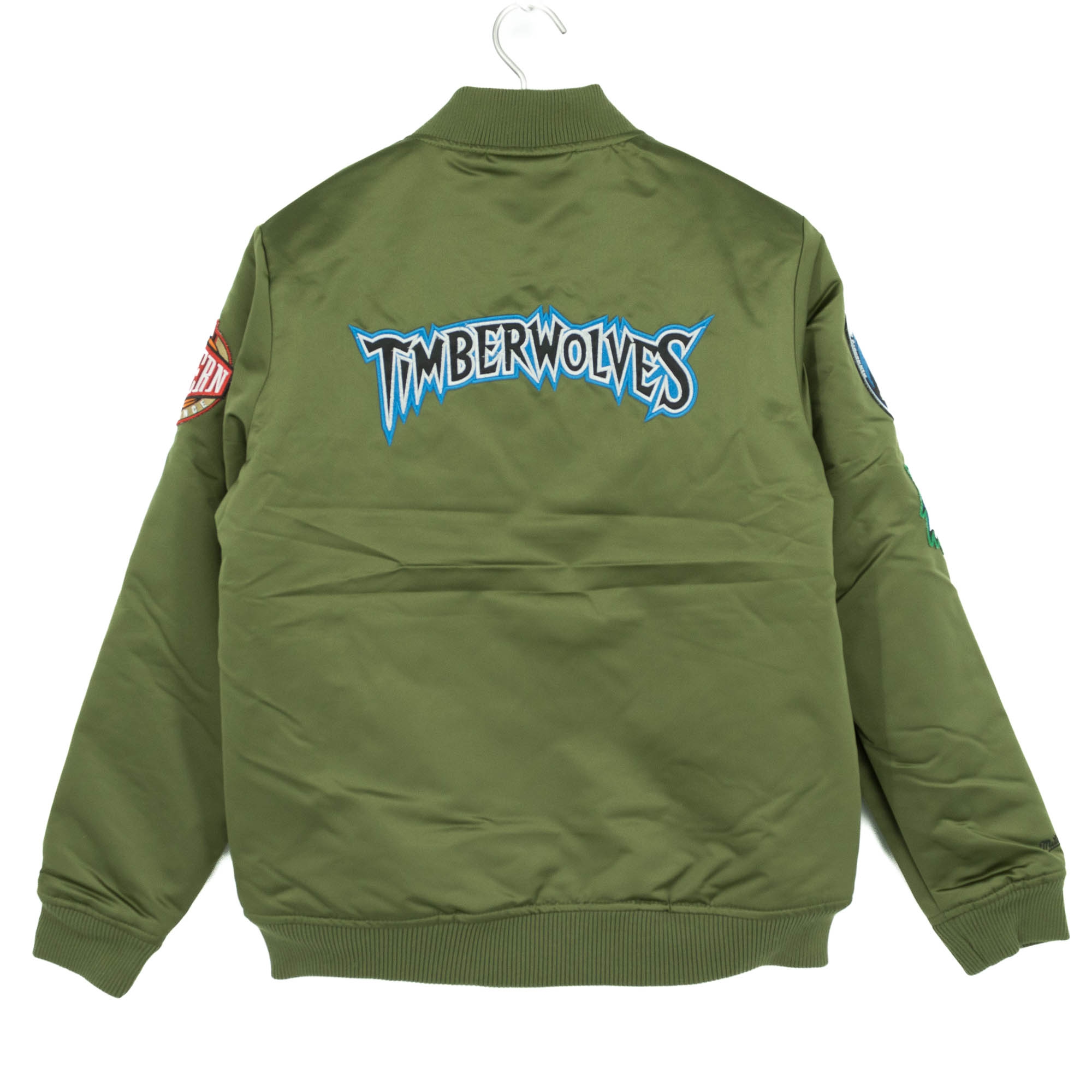 Mitchell & Ness NBA Men's Olive Varsity Satin Jacket from your Minnesota Timberwolves.