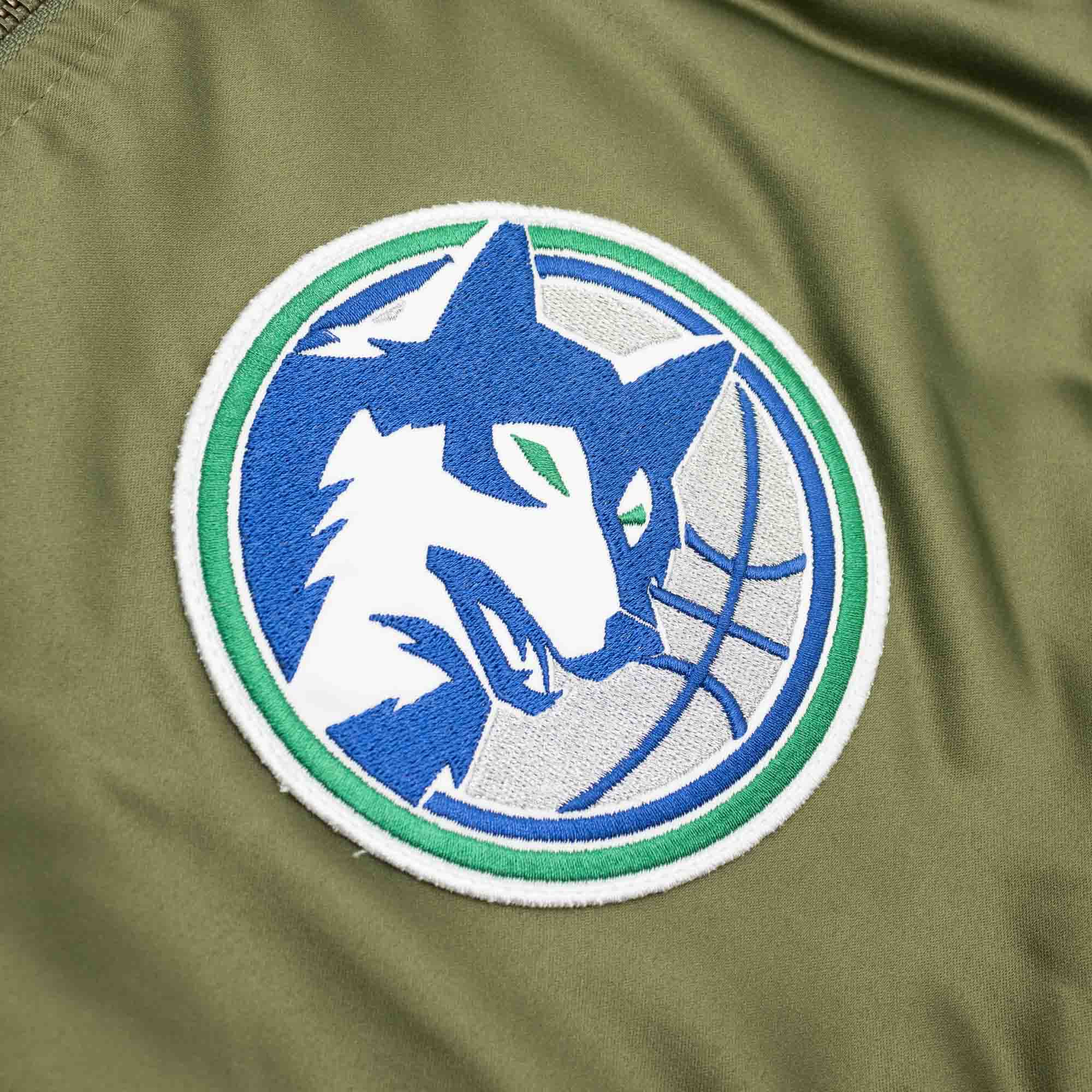 This heavyweight NBA satin jacket features an olive green outer shell combined with classic orange lining. Minnesota Timberwolves team logo and team emblem logo embroidery on front. Mitchell & Ness logo embroidered on right sleeve cuff. Left sleeve features conference logo embroidery, right sleeve features Minnesota Timberwolves team emblem and 20 Seasons Patch. With large team wordmark embroidery on back.