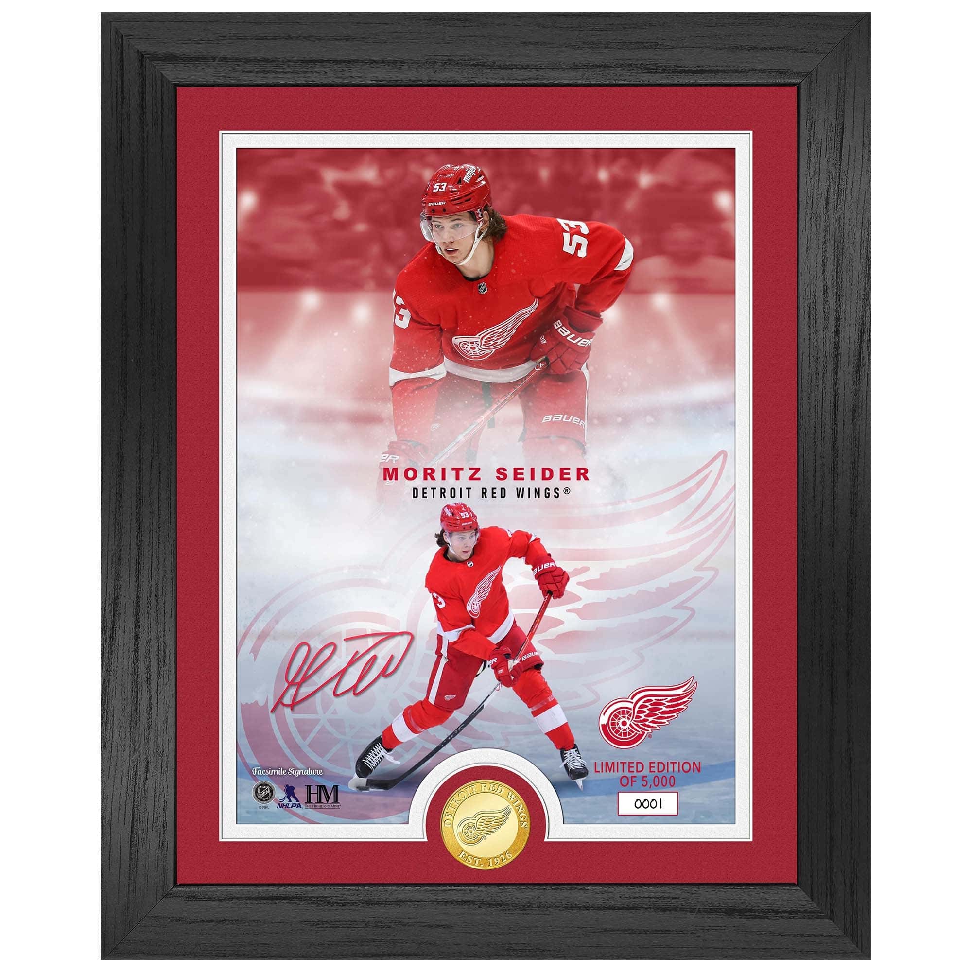 Highland Mint NHL Frame from Detroit Red Wings Superstar Moritz Seider with Minted Bronze Coin. Limited Edition of 5,000.