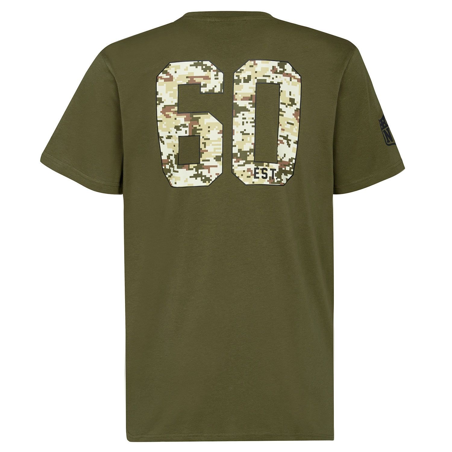 This New Era premium quality cotton t-shirt is the perfect addition for your 2020 NFL Salute to Service Style. Front features small New England Patriots logo, back features large 60 to commemorate the establishment date. Embroidered new era flag on left sleeve and dark NFL shield print on right sleeve. Rib crew neck with interior taping.