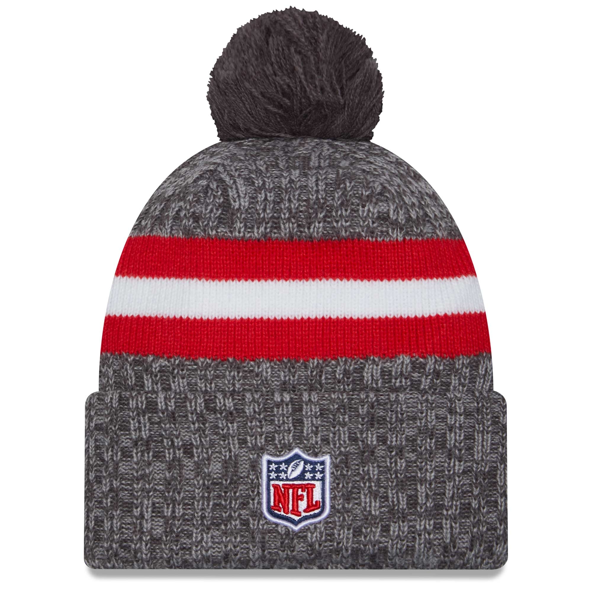 New Era American Football Knit Hat with Pom from your New England Patriots. Part of the Gray Colorway 2023 NFL Sideline Collection.