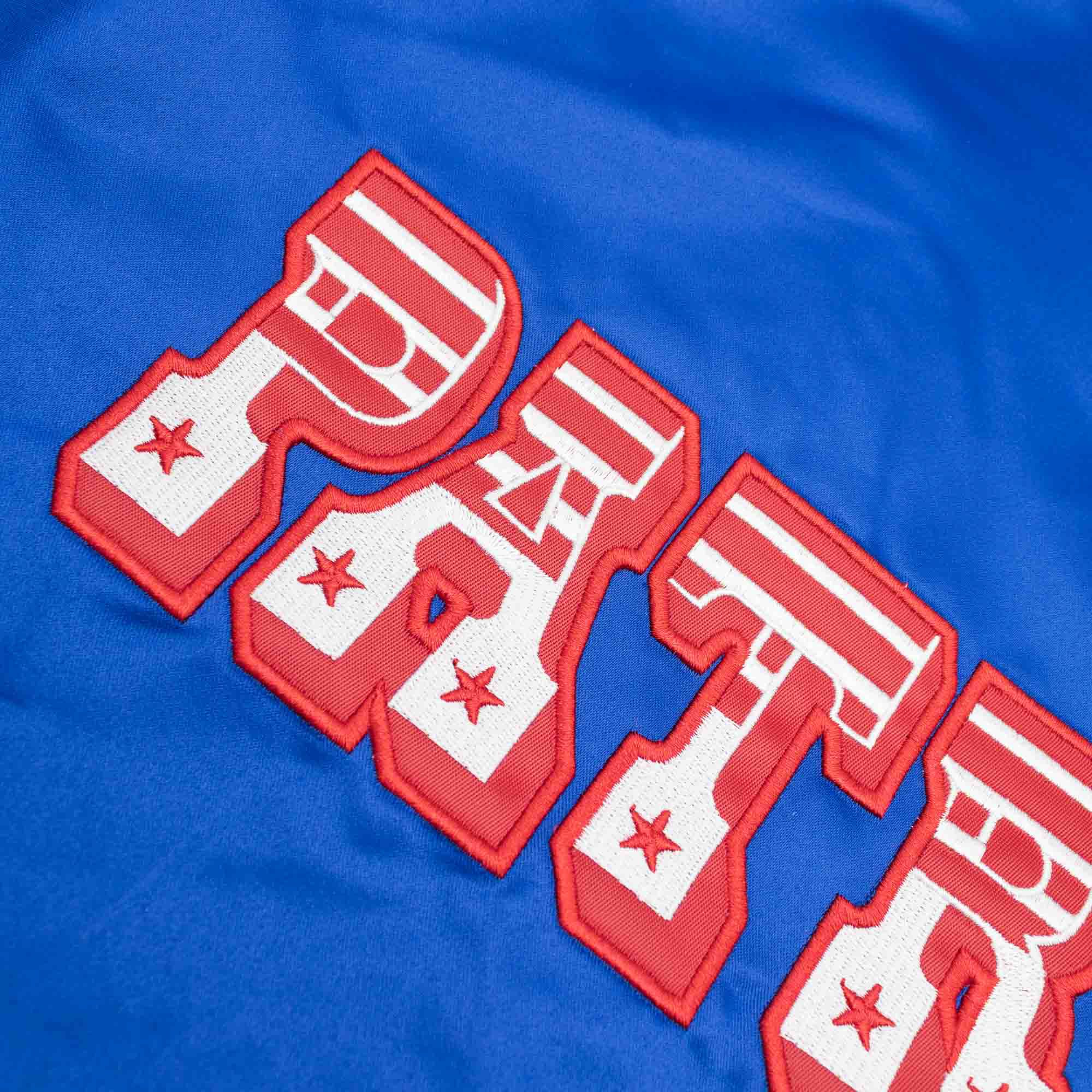 This heavyweight NFL satin jacket features New England Patriots classic team logo and conference logo embroidery on front. Mitchell & Ness logo embroidered on right sleeve cuff. Contrast color self-fabric taping on sleeves.
