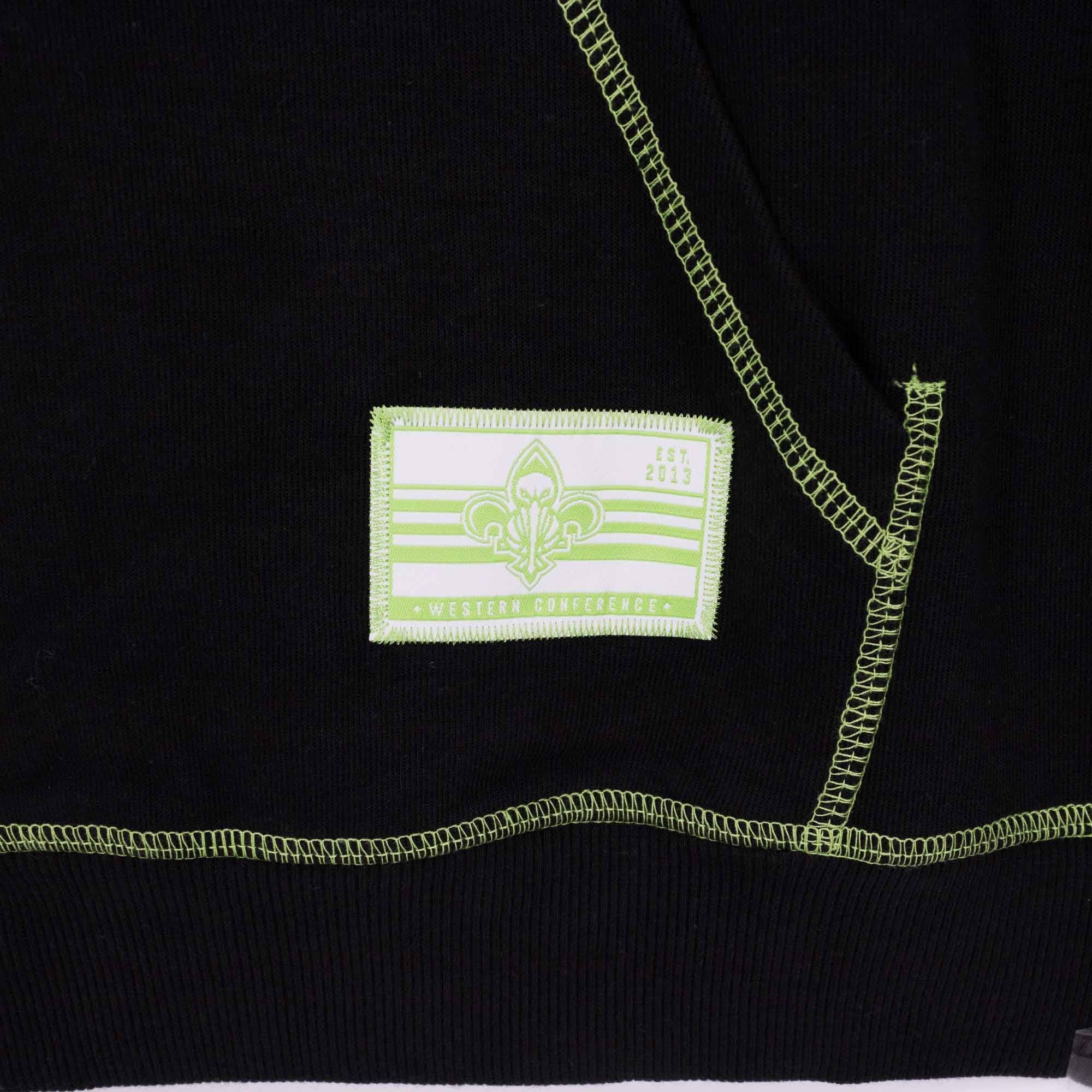 The New Orleans Pelicans 2023 City Edition Black Hoodie features a mesh applique NEW ORLEANS wordmark and embroidered team logo at the chest with a team jock tag at the kangaroo pocket.