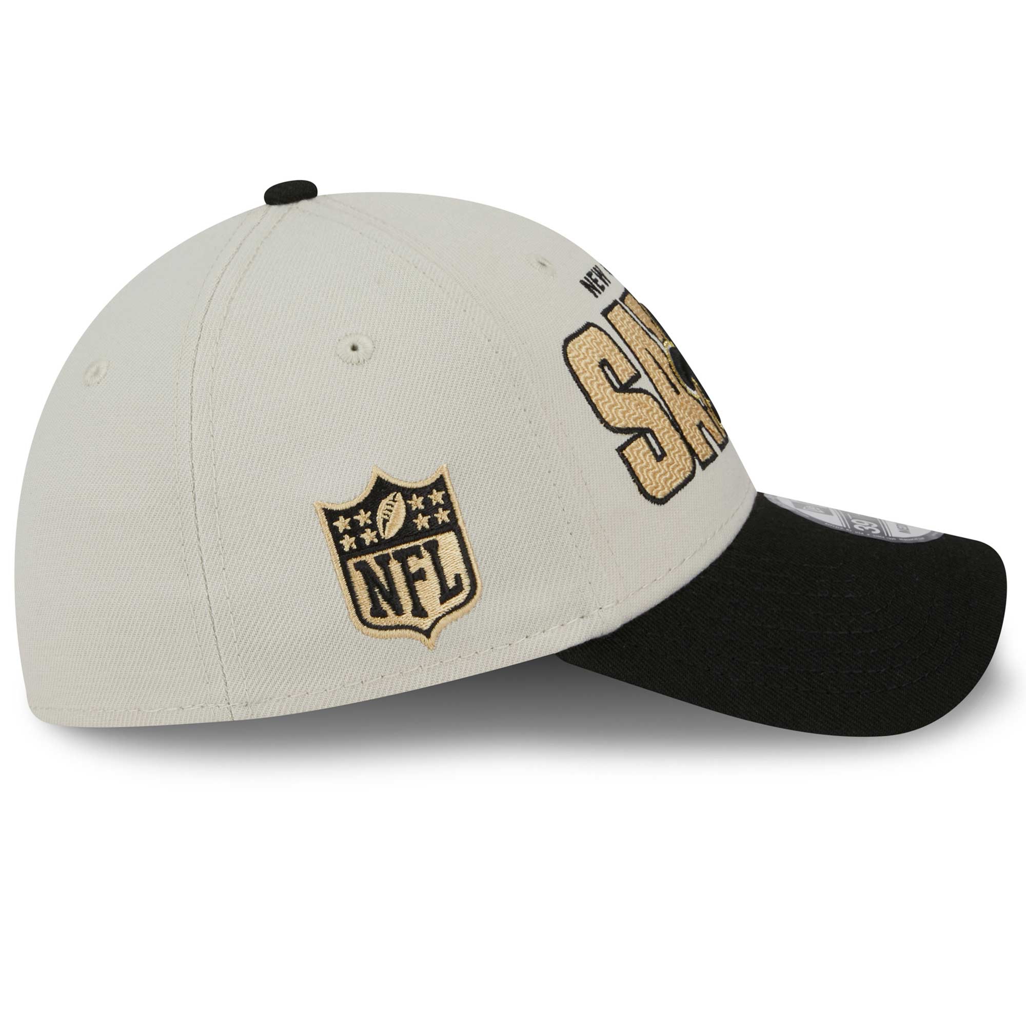 The official 2023 NFL Draft Cap from NFL supplier New Era features a two-tone design with high-quality embroidered logos. The front of the cap is embroidered with a large SAINTS wordmark and the team logo in the background. Back features the official team logo, also embroidered. The NFL Shield on the right side of the cap completes the unique American football design. The cap crown is subtly stone gray, while the cap brim is designed in the official team color, creating a striking contrast. The underside of the brim is gray.