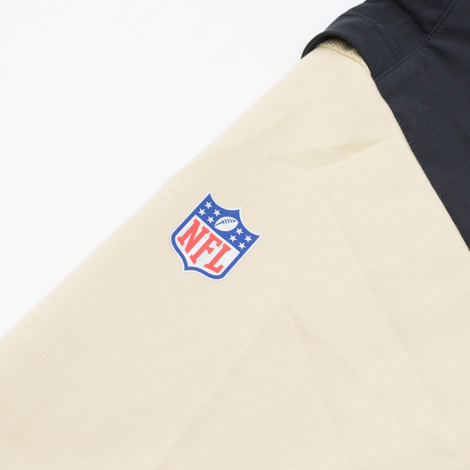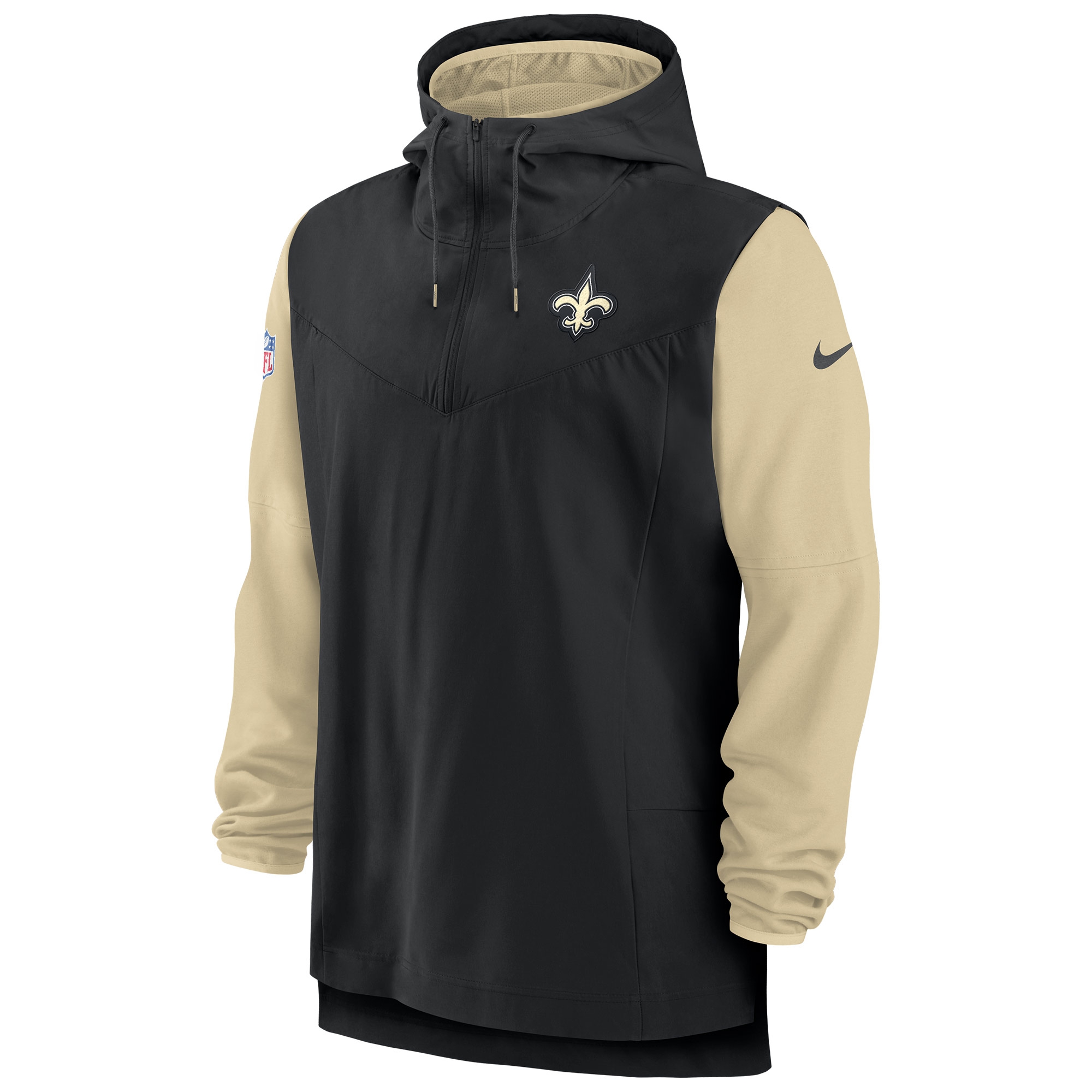 The Nike On-Field Sideline Player Jacket is built for the gridiron with performance functionality. It features a built-in back vent and fleece-lined forearms to help provide proper warmth and coverage without sacrificing breathability. Quarter-zip for easy temperature adjustment. New Orleans Saints team logo embroidered at left chest. Nike Swoosh logo printed on the left sleeve and official NFL Sideline shield logo on right sleeve. Water repellent technology keeps you protected from the elements. With sleeve cut lines for a short sleeve customization you can wear this hoodie even when the temperatures rise.