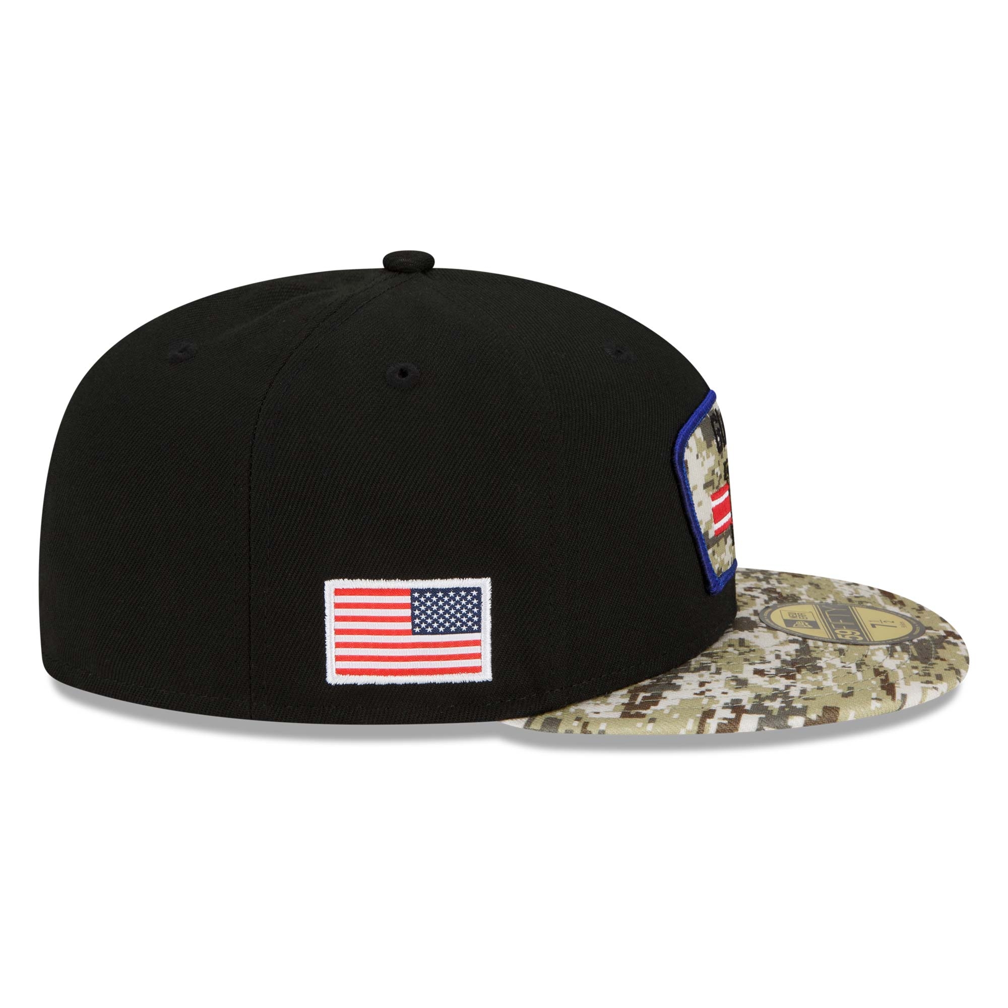 This 2021 NFL Salute to Service fitted hat is designed to support the American military branches. It features New York Giants camo team patch on front and American state flag patch embroidered on right side. Rear decoration features NFL Salute to Service ribbon. Additional details include a digital camo visor.