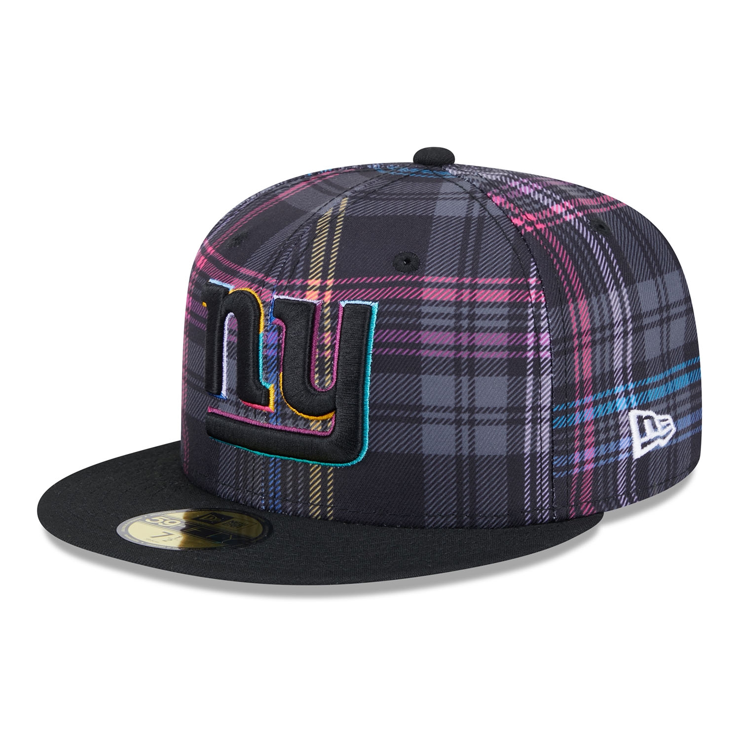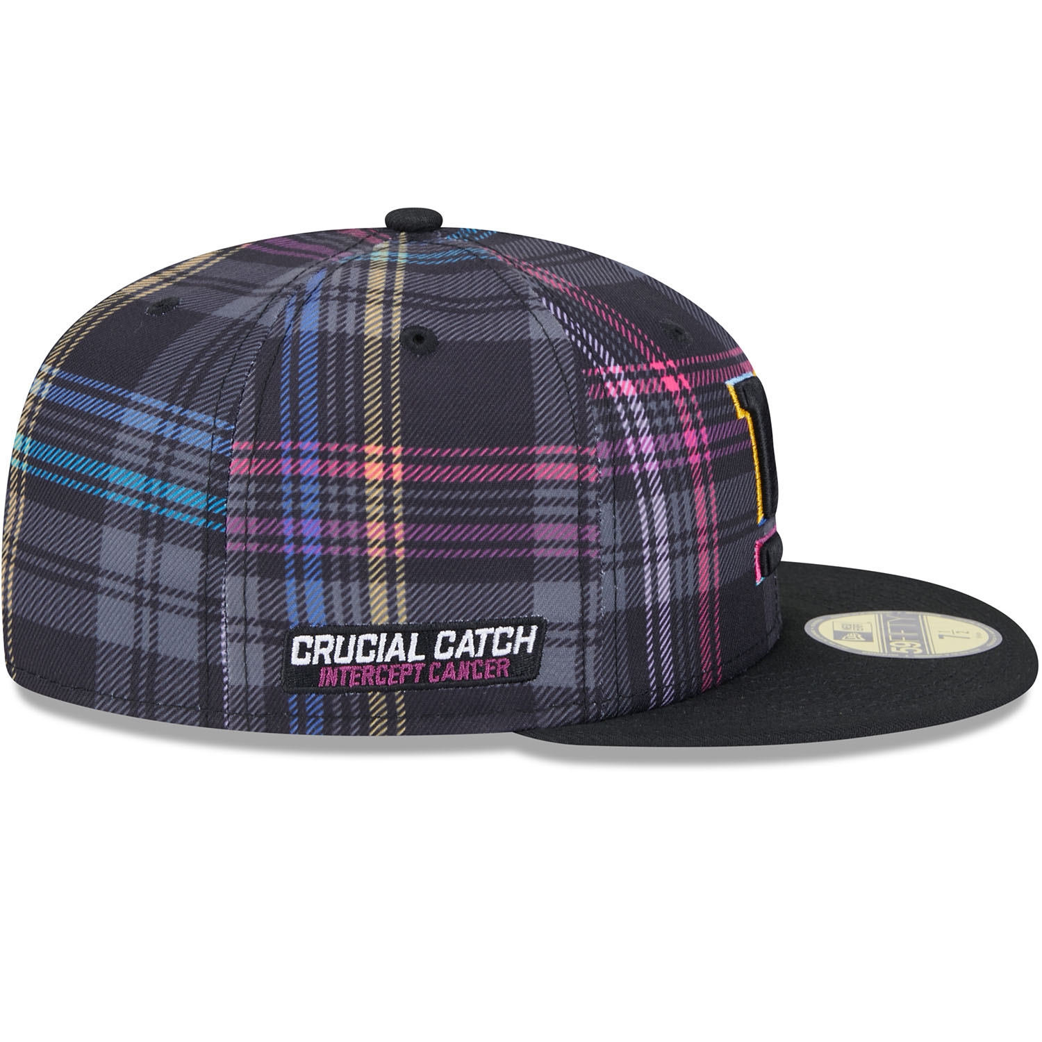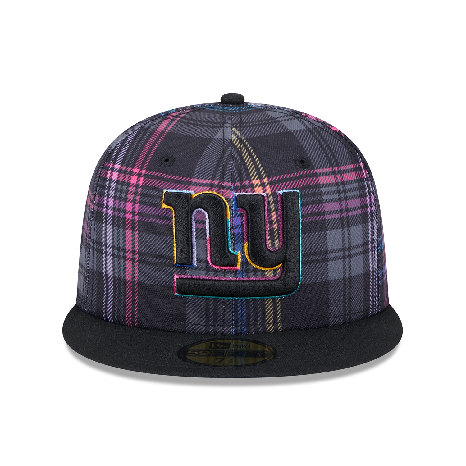 Support the global fight against cancer with the official New Era 2024 NFL Crucial Catch On-Field Cap. This closed fitted NFL cap is worn on the sidelines during the 2024-25 Crucial Catch campaign in October. The front of the cap is embroidered with the brightly accented New York Giants team logo. The right side features the "CRUCIAL CATCH - INTERCEPT CANCER" patch, while the back is adorned with the embroidered NFL logo. The sublimated plaid design on all six panels in the signature Crucial Catch colors gives it a unique look.