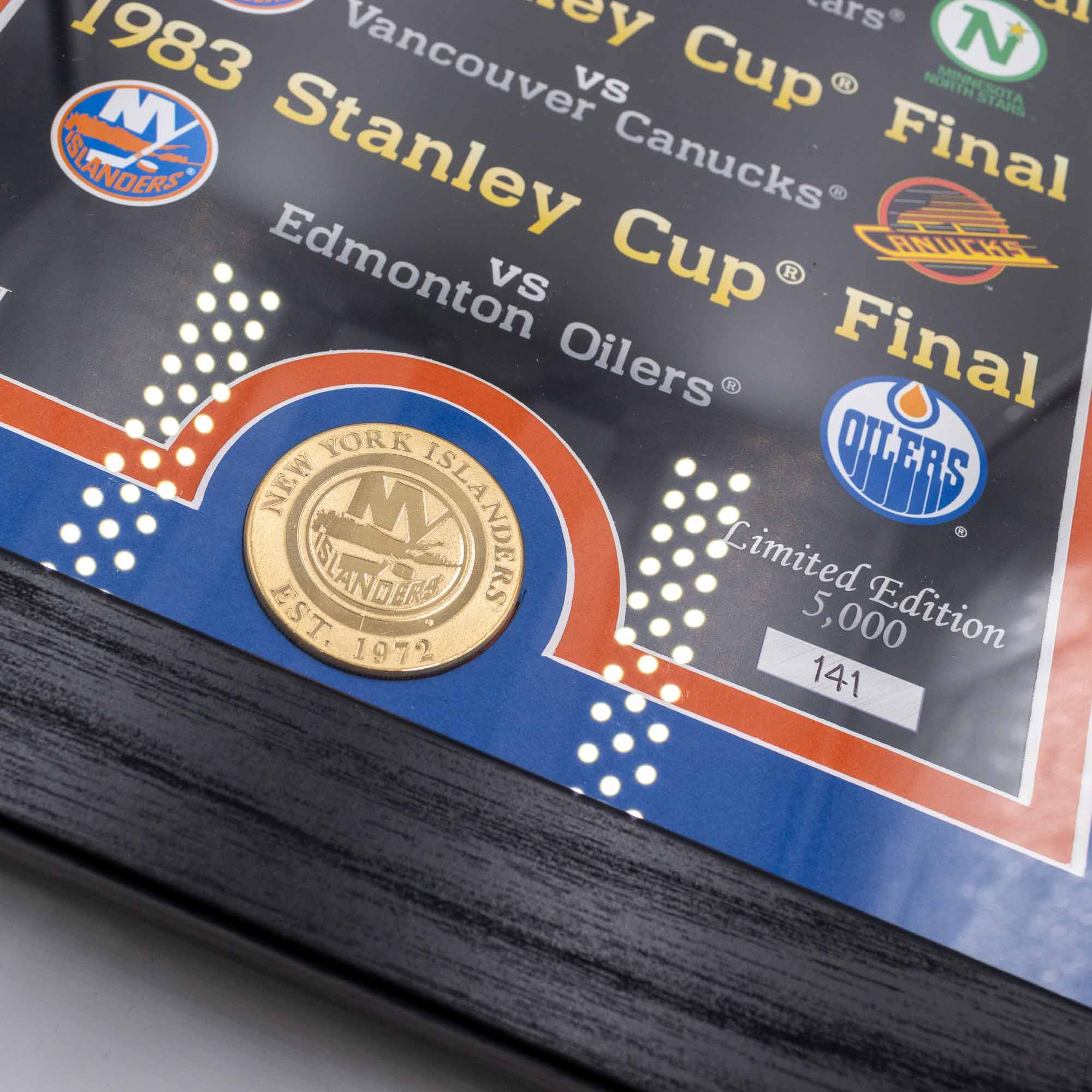 A Limited Edition commemorating the 4-time Stanley Cup Champion New York Islanders! This 12" x 20" Frame with double matting and a glass front panel features a custom and individually numbered 15" x 7" commemorative photo listing each of their Stanley Cups and a minted 39mm solid bronze team commemorative coin.