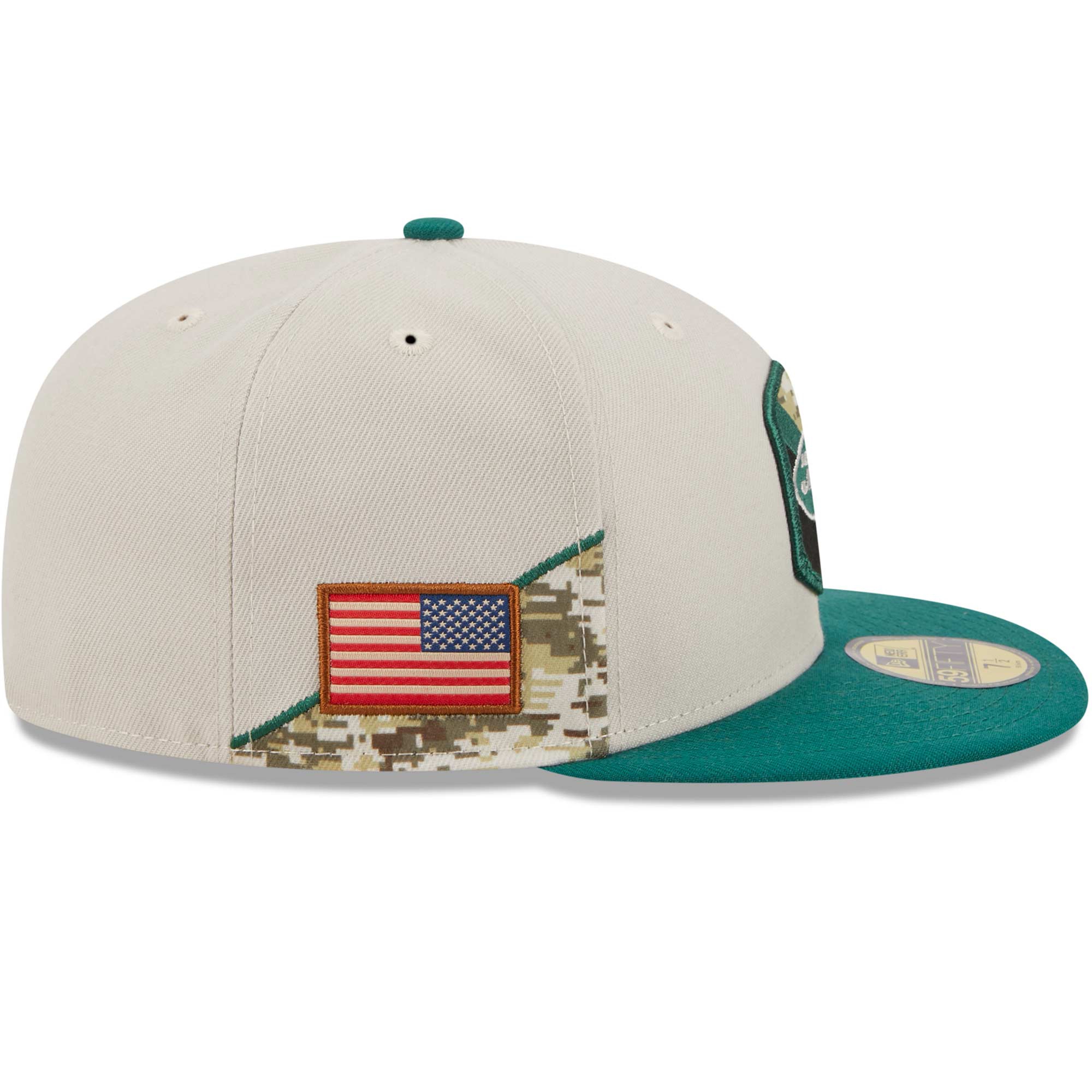 This 2023 NFL Salute to Service snapback hat is designed to support the American military branches. It features New York Jets camo team patch on front and American state flag patch embroidered on right side. Rear decoration features NFL Salute to Service ribbon. Additional details include a team color visor and digital camo undervisor.