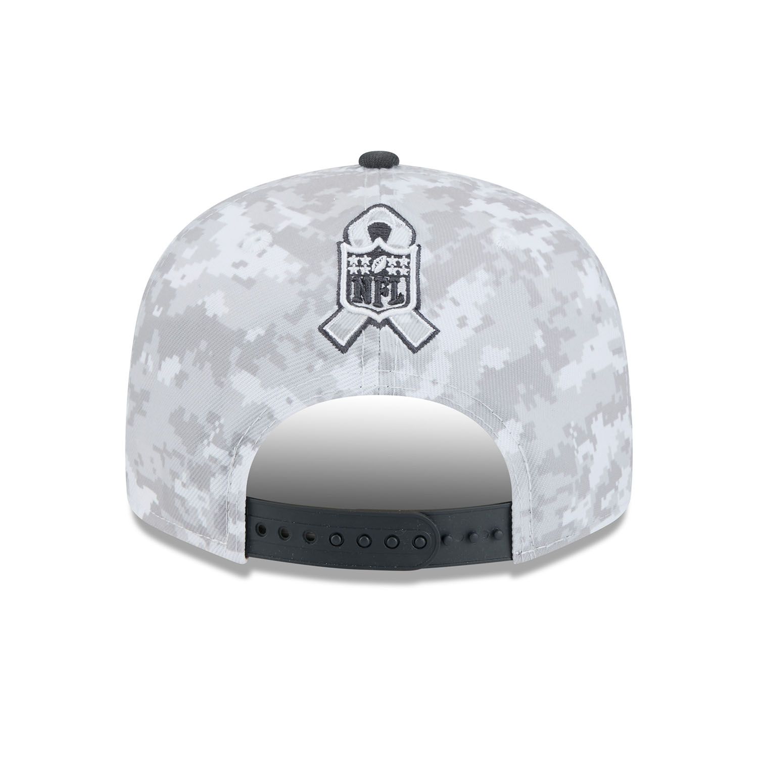The 2024 NFL Salute to Service Caps by New Era impress with their camouflage team design! The front of the cap features a high-quality, 3D-embroidered New York Jets team logo, while the open back is adorned with the embroidered Salute to Service NFL shield with ribbon. The right side of the cap is embroidered with the American flag and the Salute to Service lettering.