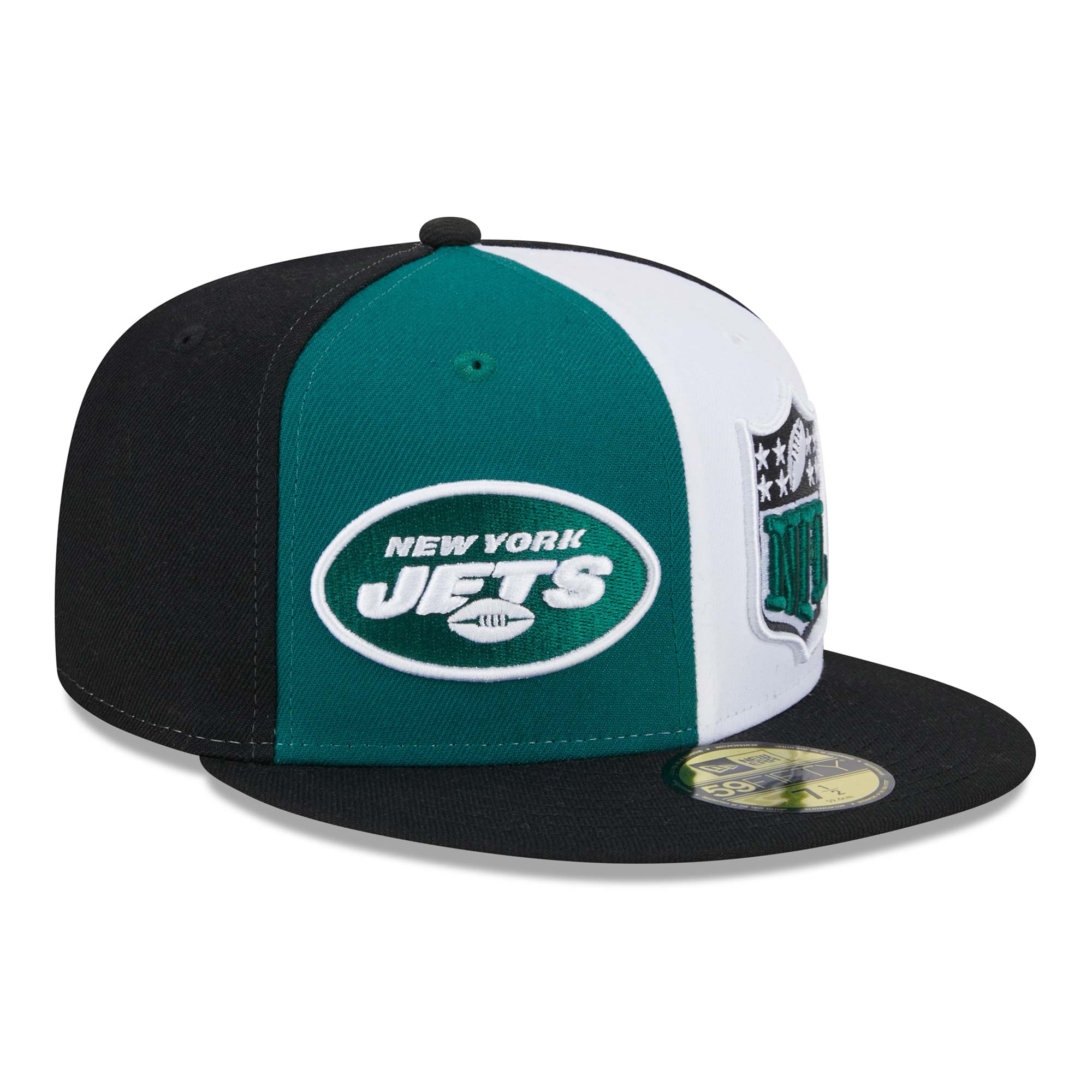 Color up your NFL Gameday with the 2023 NFL Sideline headwear collection. This tricolored New York Jets cap impresses any football fan with the combination of official team colors combined with a white base color. The cap's front features a high-quality embroidered team logo and an oversized NFL Shield on two different colored backgrounds. The brilliant team design is rounded off with the embroidered wordmark logo on the closed back. The underside of the brim is gray, and the sweatband is black.