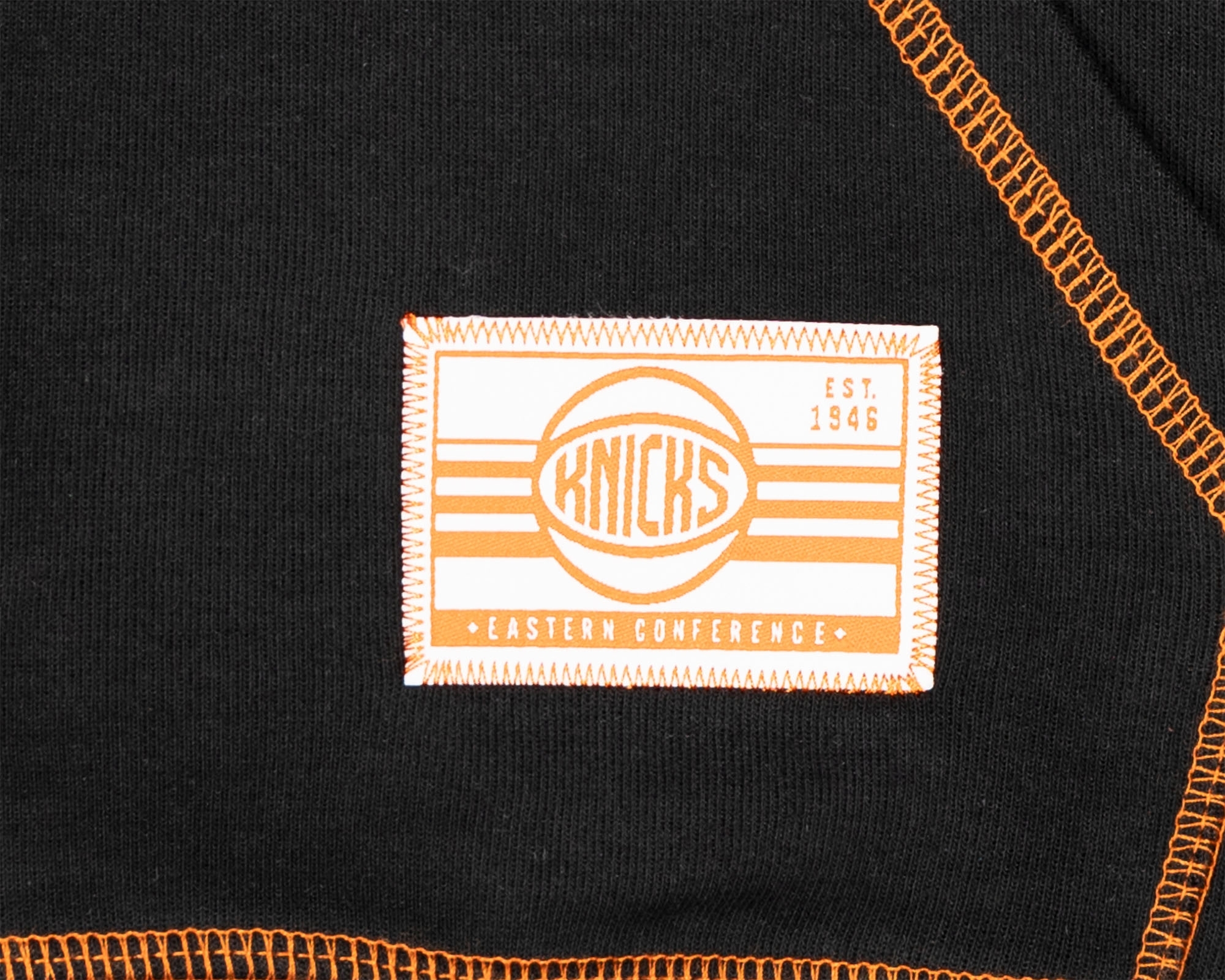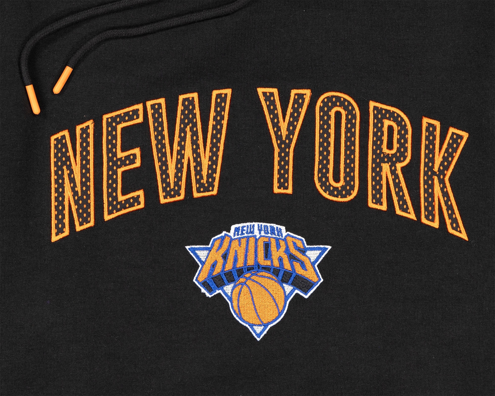 The New York Knicks 2023 City Edition Black Hoodie features a mesh applique NEW YORK wordmark and embroidered team logo at the chest with a team jock tag at the kangaroo pocket.