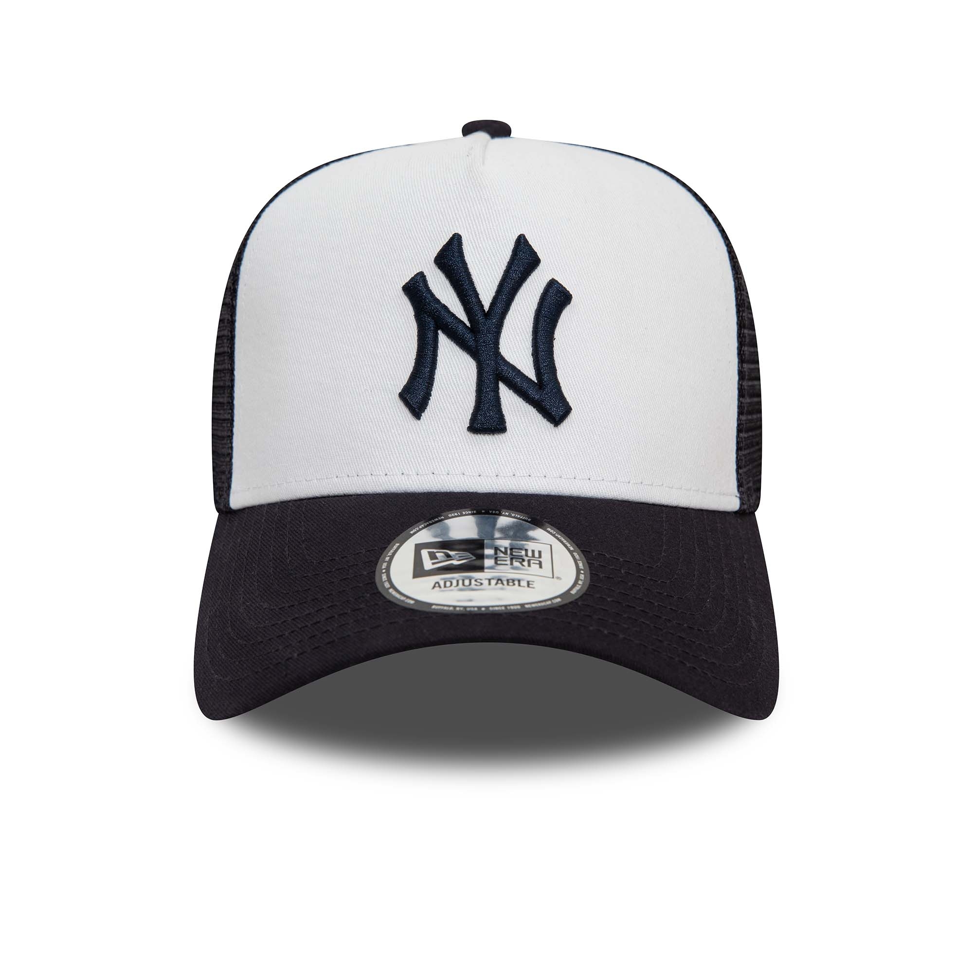 This official MLB Trucker cap features New York Yankees team logo embroidered on white trucker front. Fully adjustable snapback closure. Two-tone design.