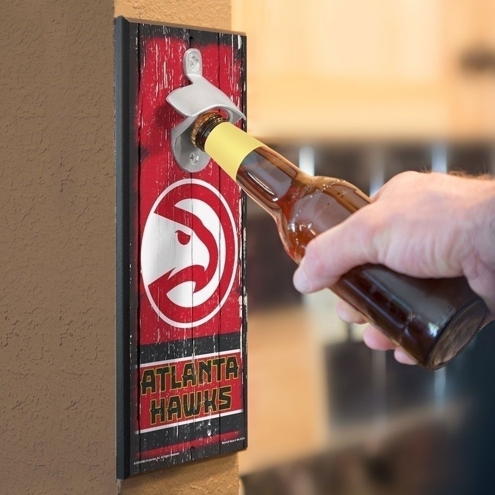 The Oklahoma City Thunder Bottle Opener Wood Sign is a classic retro fan cave essential. The 3/8" hardboard sign has a tough cast opener securely attached, and two mounting holes are drilled for easy hanging. We recommend that you screw in the sign to the stud portion of your wall.
