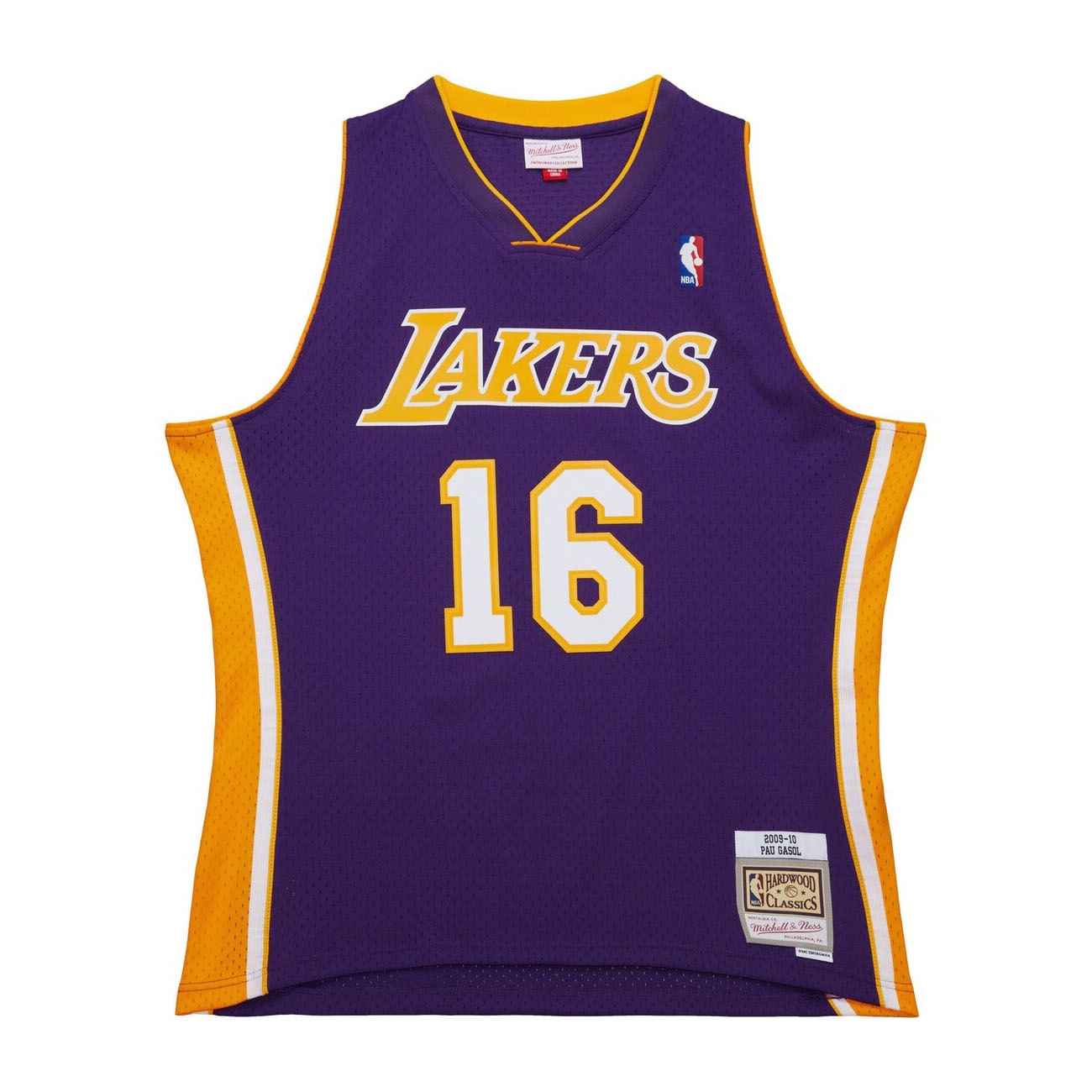 - Official Swingman NBA jersey in the classic design of the Los Angeles Lakers from the 2009-10 championship season, worn by Pau Gasol (#16), who was instrumental in the team's back-to-back title wins with his versatile play and leadership on the court.