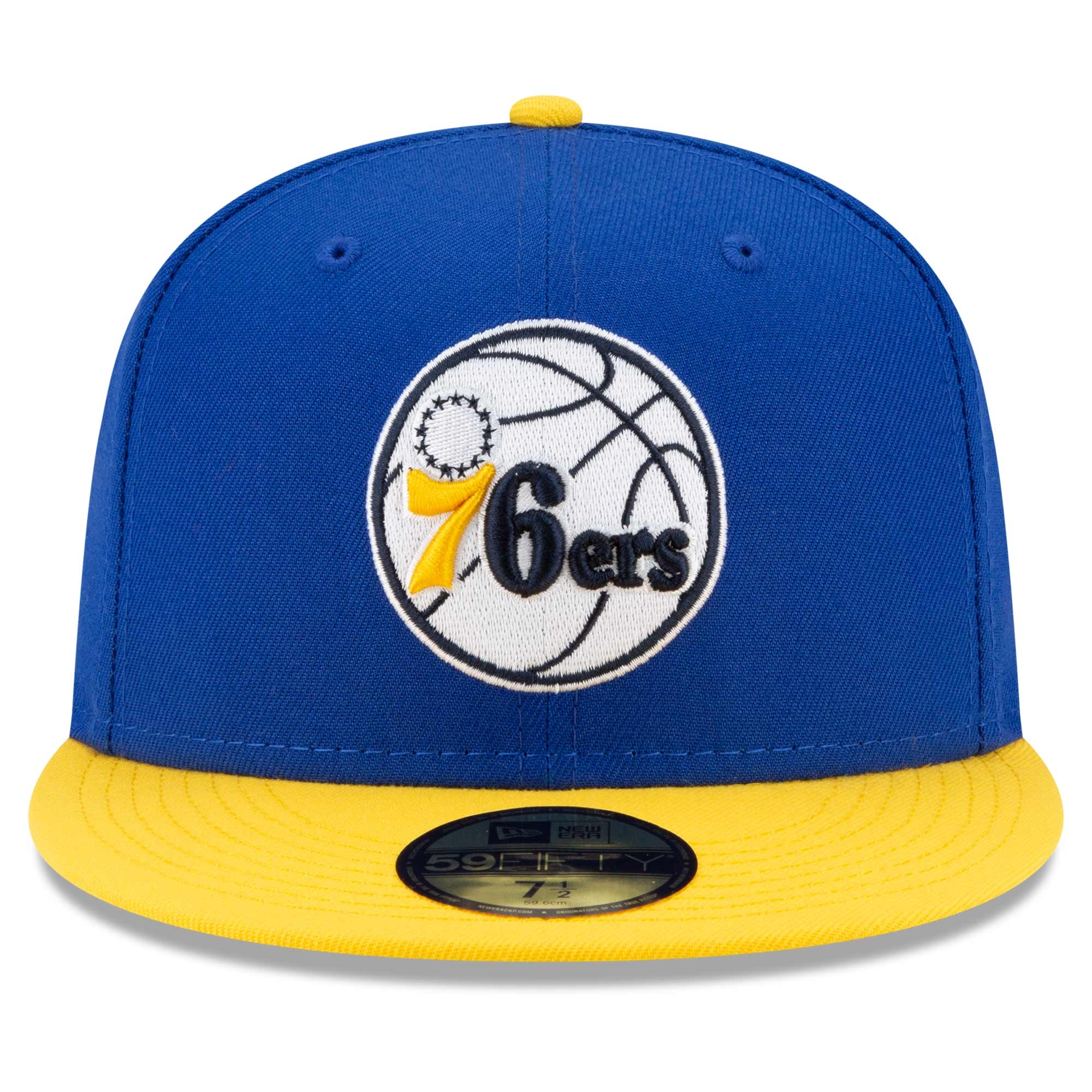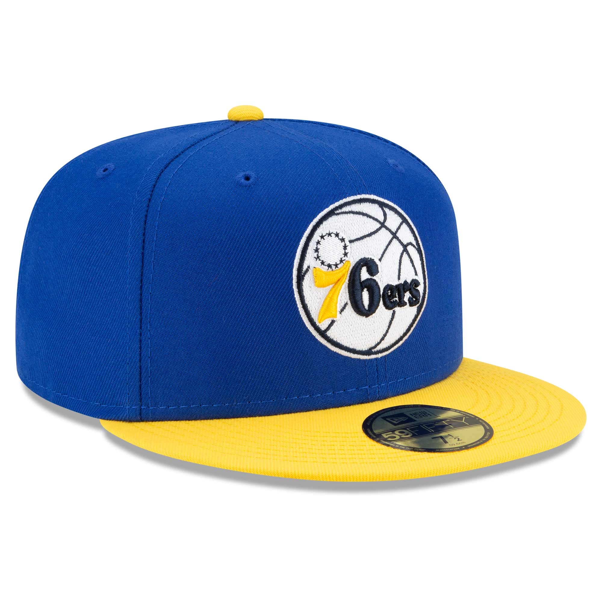 New Era 2021 NBA Flash Basketball 59FIFTY Fitted Cap from your Philadelphia 76ers. Blue-Yellow Colorpack Edition.