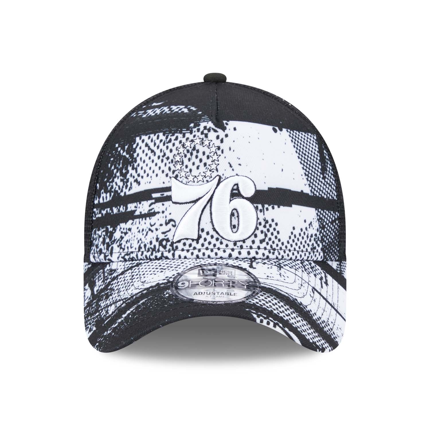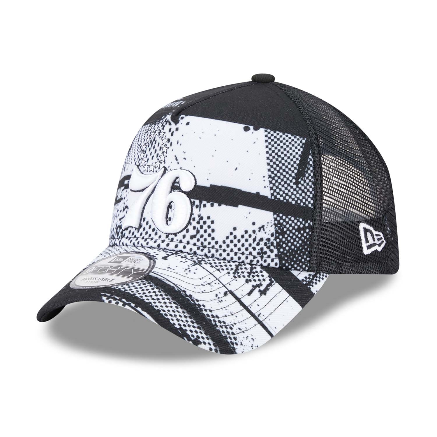 Support your team with bold style in the Philadelphia 76ers 2024 NBA Tip-Off 9FORTY A-Frame Trucker Cap from New Era. This officially licensed cap features a striking black and white graphic design that blends urban flair with iconic team elements, making it the perfect accessory for 76ers fans.