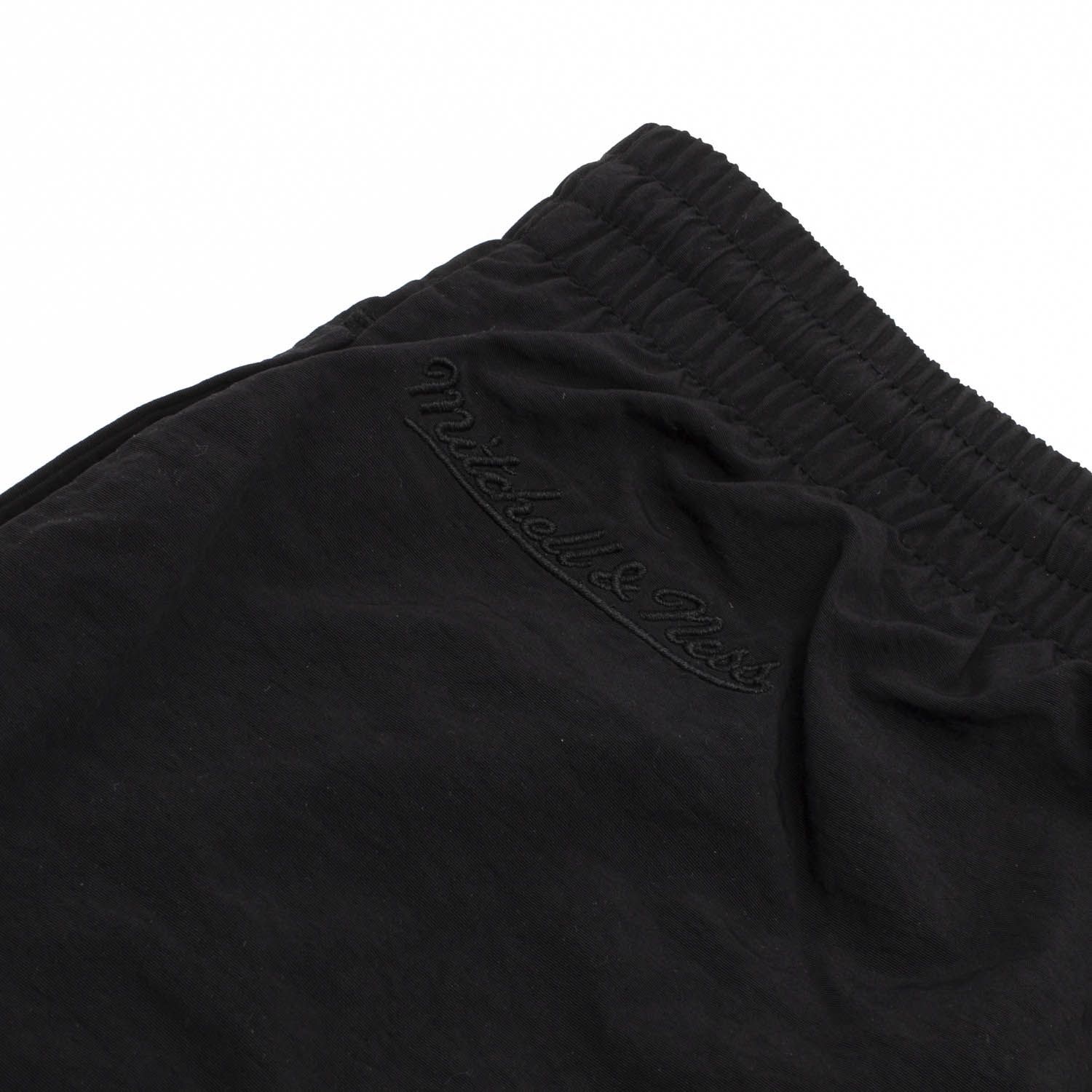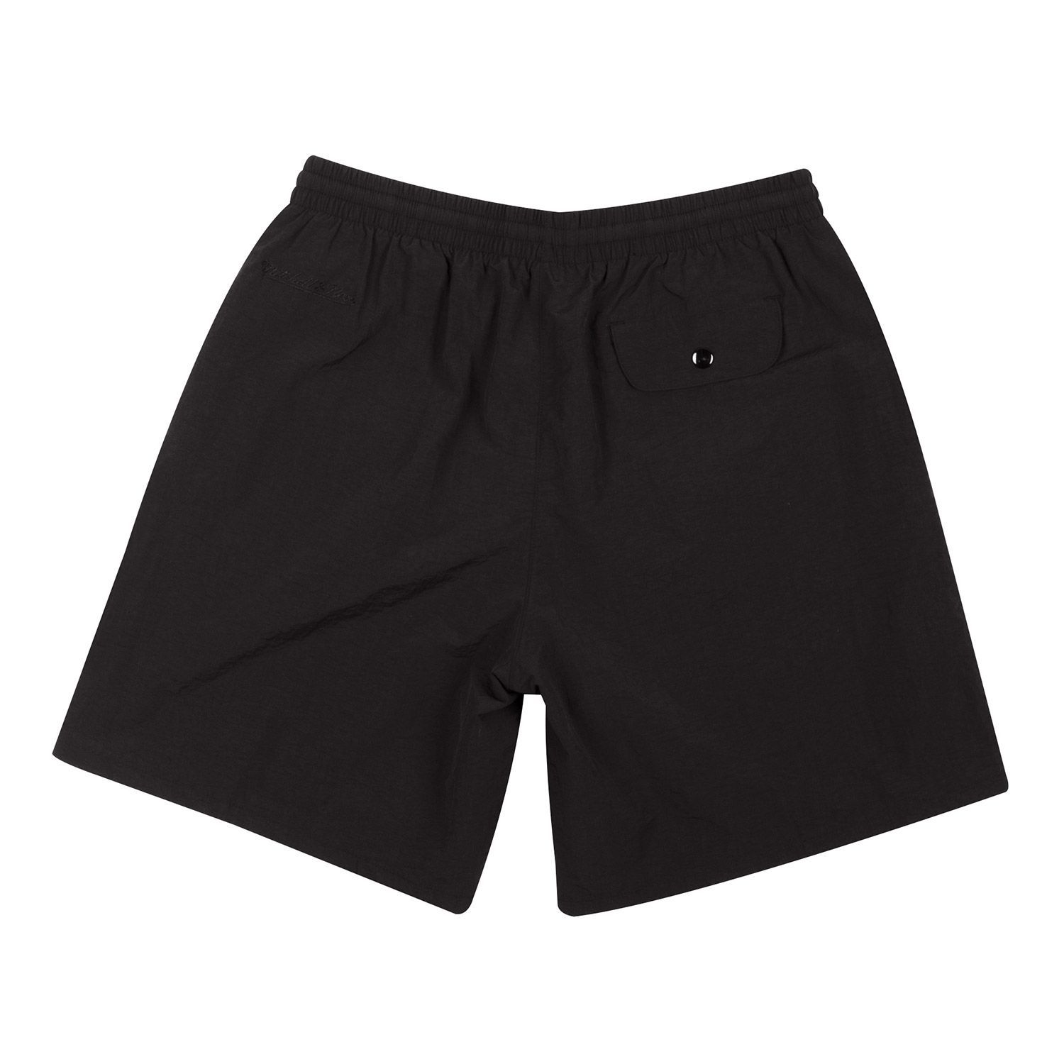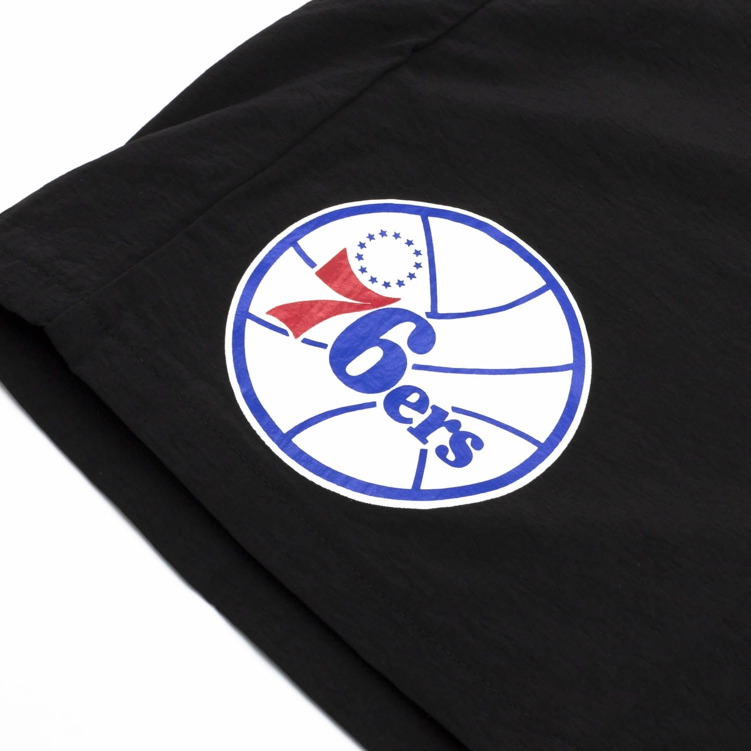 These classic Mitchell and Ness NBA shorts feature a 100% brushed nylon body and are fully lined with polyester mesh. With two side seam pockets and back pocket with snap closure. Both legs feature screen-printed Philadelphia 76ers team graphics. Drawstring waistband for easy size adjustment.