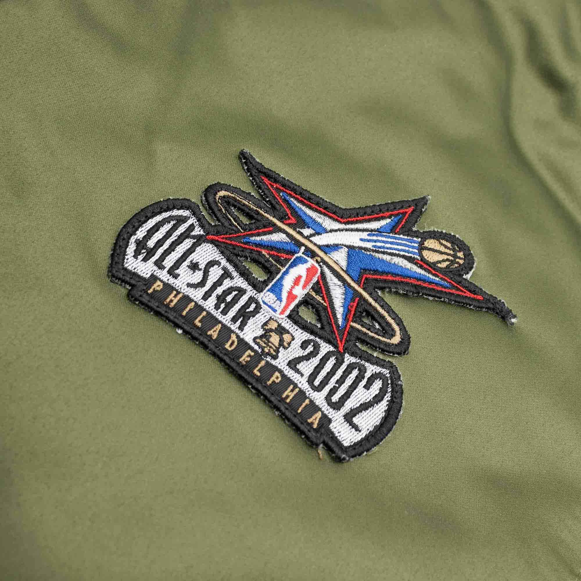 This heavyweight NBA satin jacket features an olive green outer shell combined with classic orange lining. Philadelphia 76ers team logo and All Star 2002 logo embroidery on front. Mitchell & Ness logo embroidered on right sleeve cuff. Left sleeve features conference logo embroidery, right sleeve features 76ers 60th Anniversary patch and 76 All Star Game emblem. With large team wordmark embroidery on back.