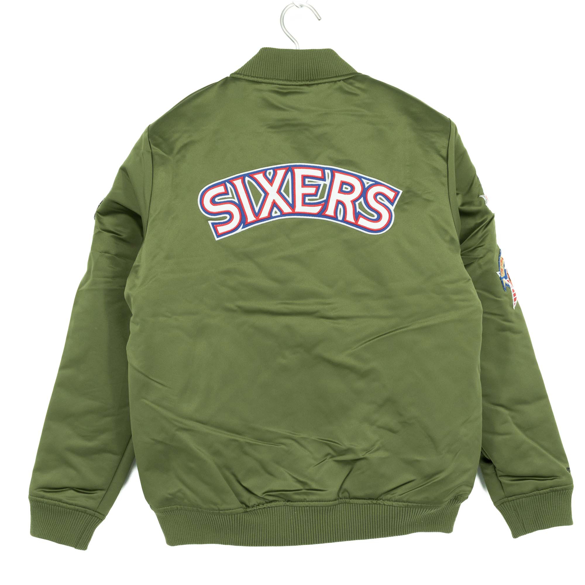 Mitchell & Ness NBA Men's Olive Varsity Satin Jacket from your Philadelphia 76ers.