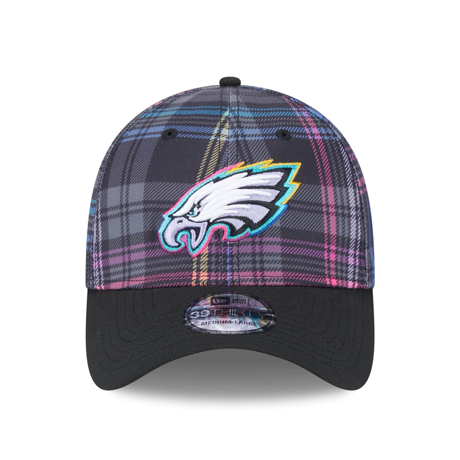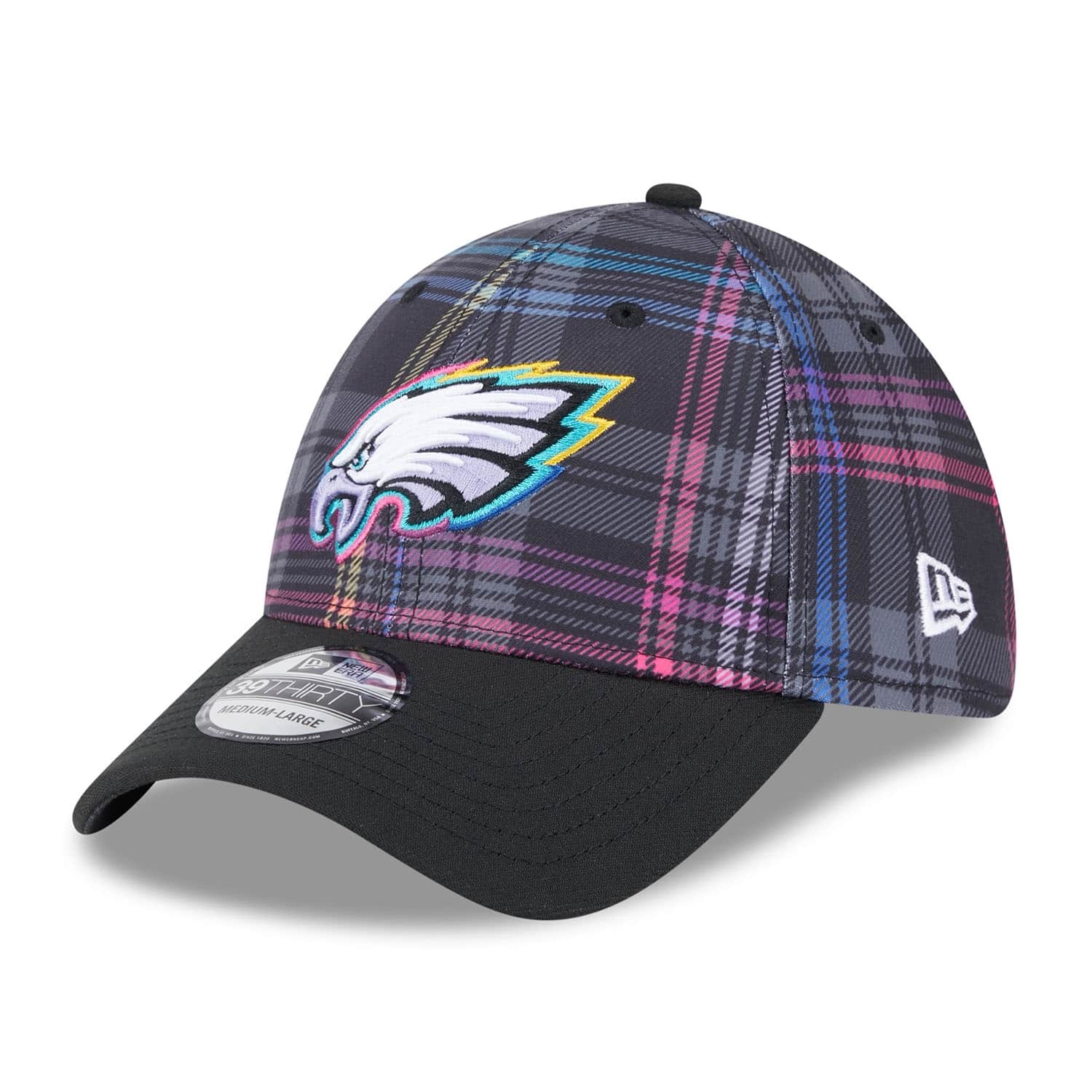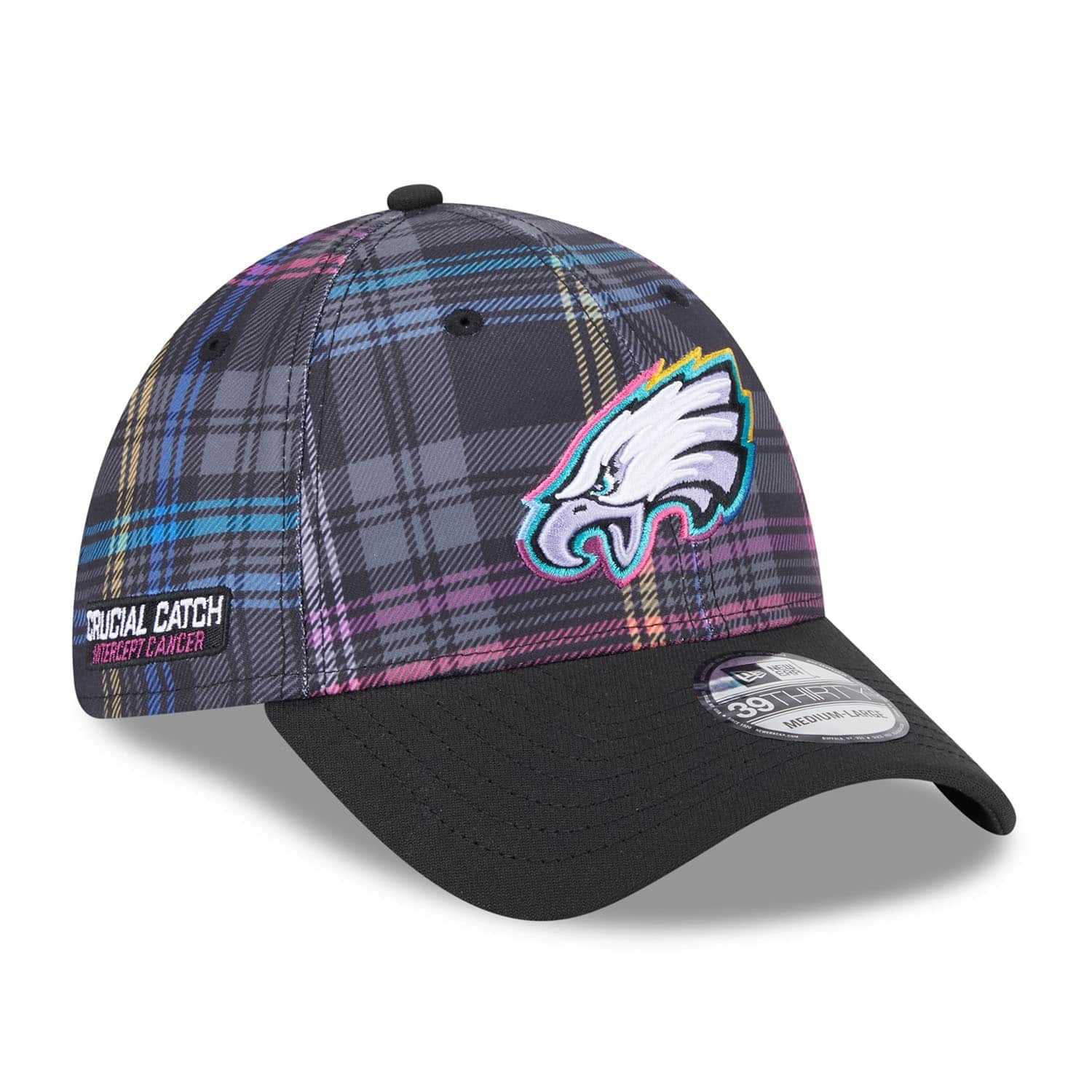 Support the global fight against cancer with the official New Era 2024 NFL Crucial Catch On-Field Cap. This stretch-fitted NFL cap is worn on the sidelines during the 2024-25 Crucial Catch campaign in October. The front of the cap is embroidered with the brightly accented Philadelphia Eagles team logo. The right side features the "CRUCIAL CATCH - INTERCEPT CANCER" patch, while the back is adorned with the embroidered NFL logo. The sublimated plaid design on all six panels in the signature Crucial Catch colors gives it a unique look.