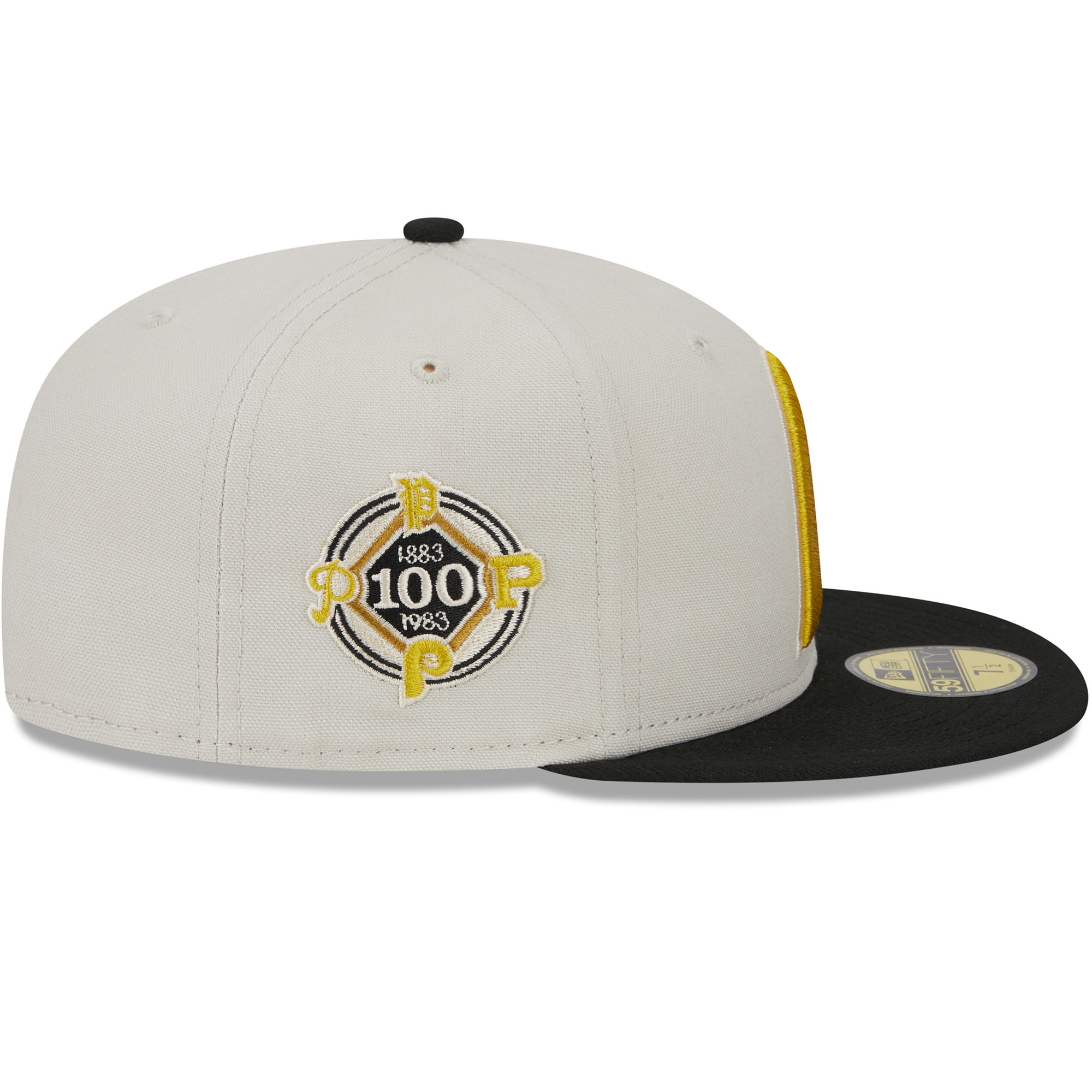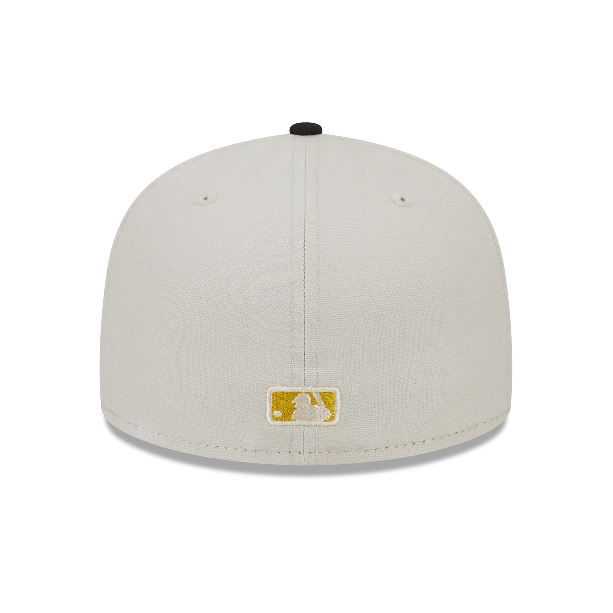 The two-tone Stone Fitted Cap by New Era delivers a robust gray canvas crown with gold accents. Front features embroidered team logo. Back shows MLB batterman logo. Right side decoration with unique team patch.