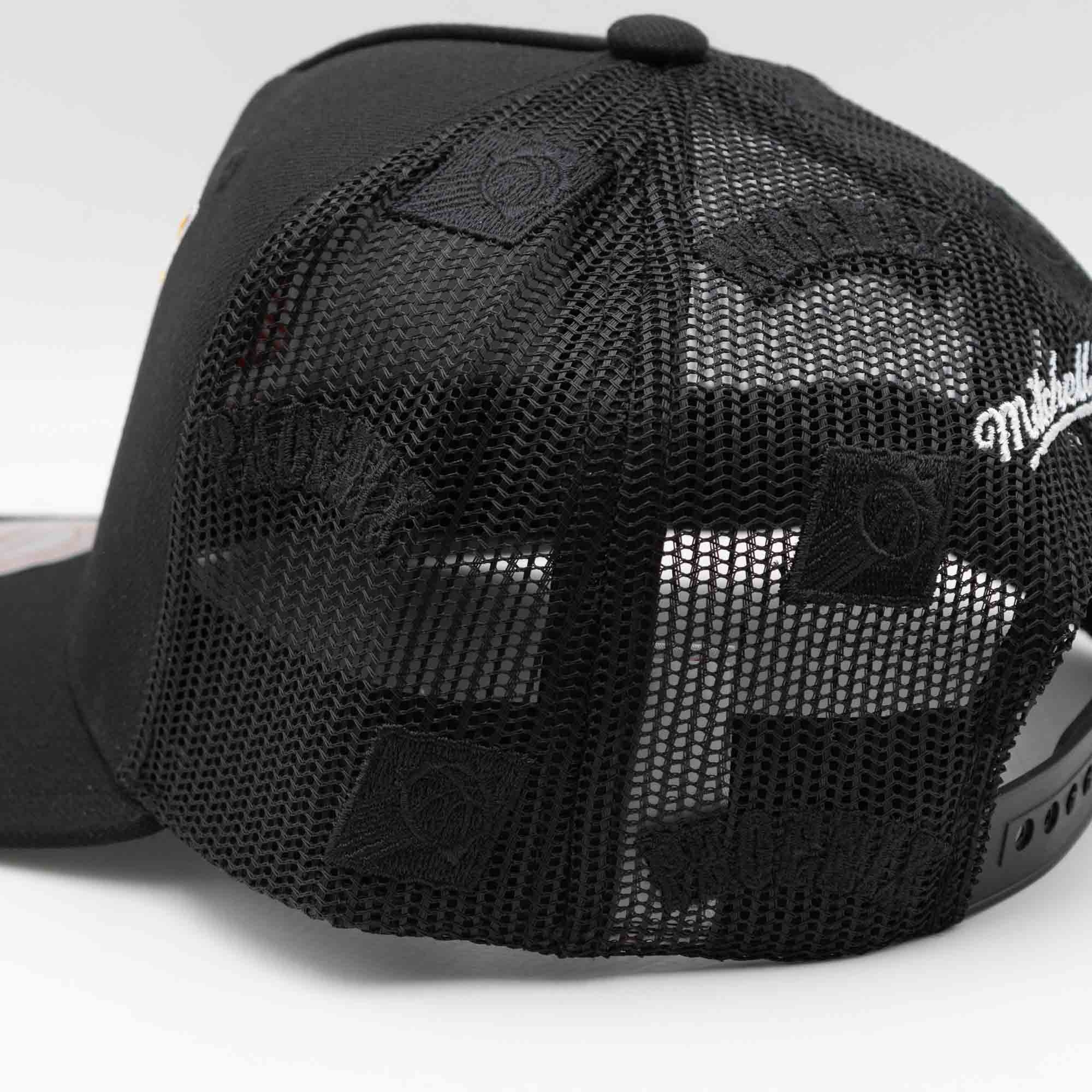Mitchell & Ness Adjustable Fit Trucker profile with a high structured crown and small, curved visor. Trucker mesh back for breathability. Interior includes branded taping as well as a moisture absorbing sweatband. A snapback closure for an adjustable fit.