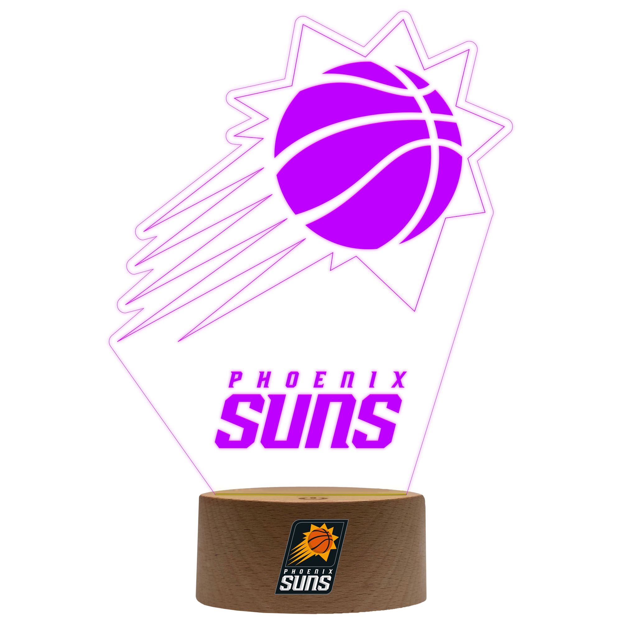 The LED team logo sign lights up all NBA eyes! The laser-engraved acrylic sign comes in an authentic basketball court design including your Phoenix Suns' team logo. The sign can be assembled easily with the included NBA base.