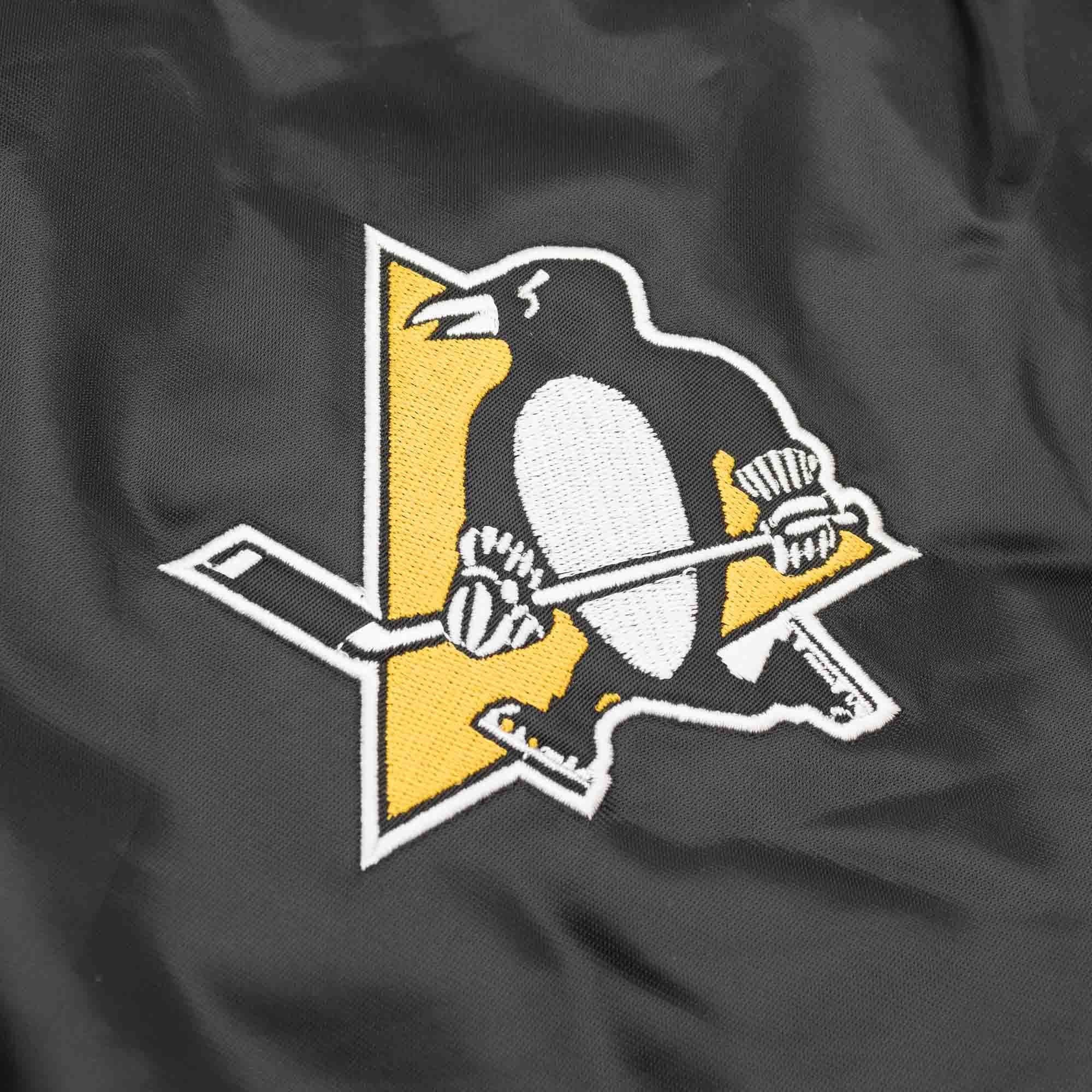 This Enforcer Starter Varsity Satin Jacket features fully embroidered team applications and the contrasting sleeves. With embroidered Pittsburgh Penguins team logo on left chest. Official team colored NHL Shield on right sleeve. The legendary Starter logo can be found on the left sleeve as a high-quality embroidery, as well as in the collar and on the inside pocket as a sewn-on label.