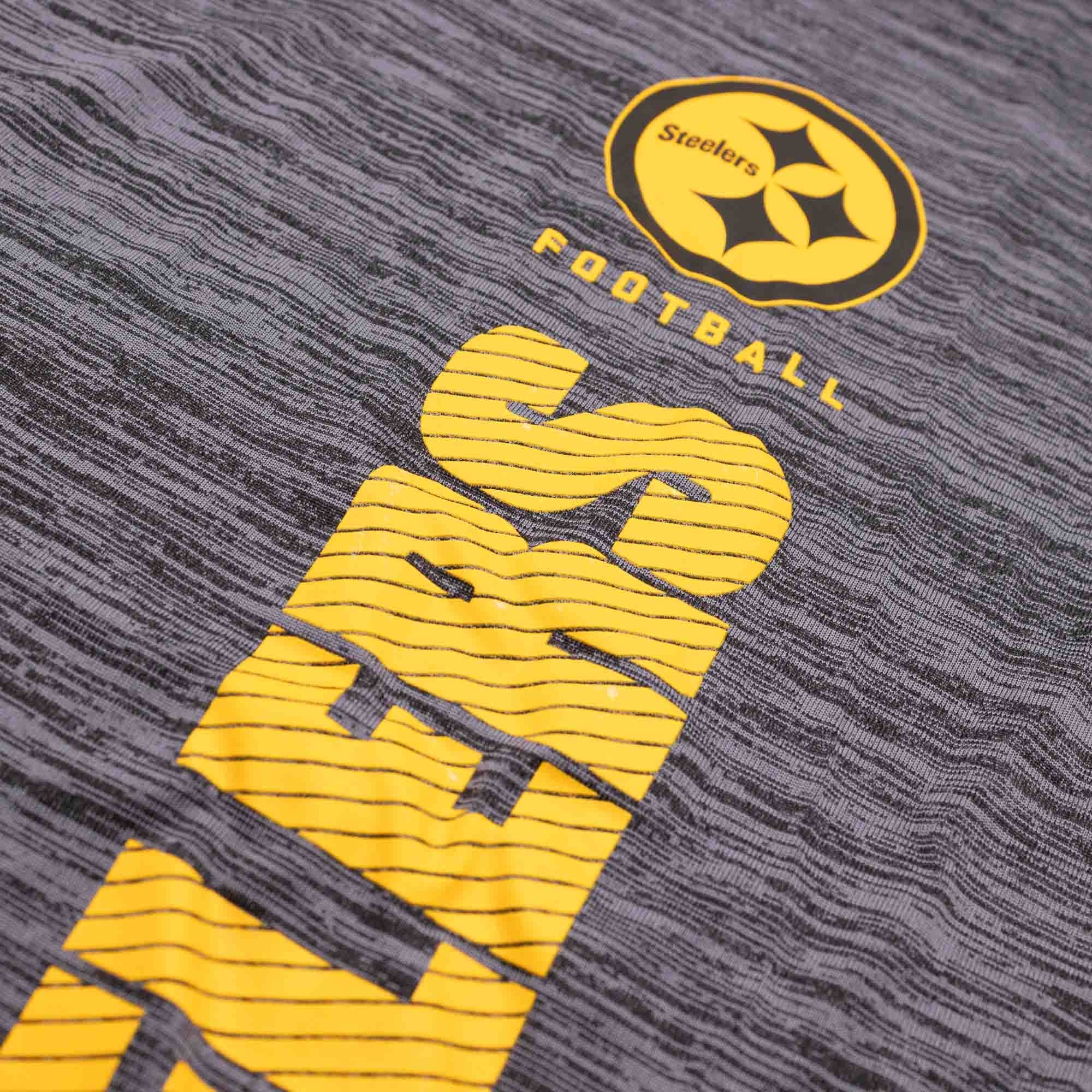 It features a large Pittsburgh Steelers front print, the NFL Sideline Shield logo on the right sleeve, and the Nike Swoosh on the left. Made from lightweight and soft 100% performance polyester for optimal comfort.