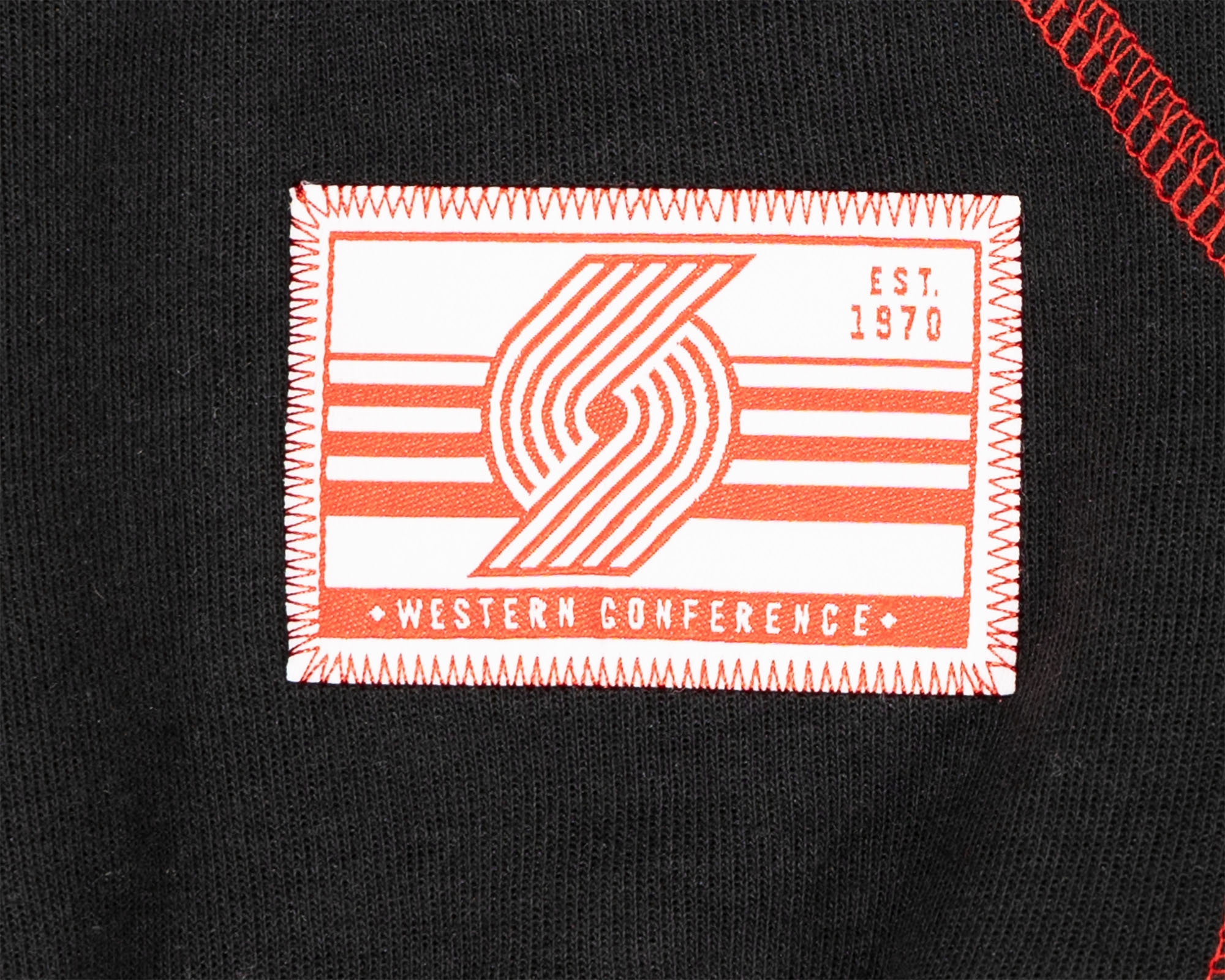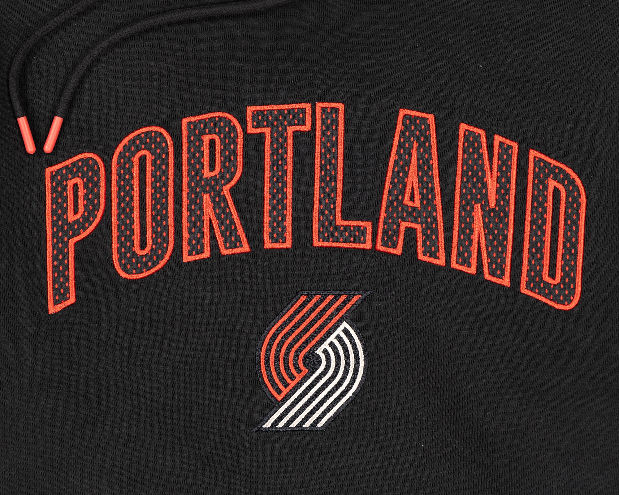 The Portland Trail Blazers 2023 City Edition Black Hoodie features a mesh applique PORTLAND wordmark and embroidered team logo at the chest with a team jock tag at the kangaroo pocket.