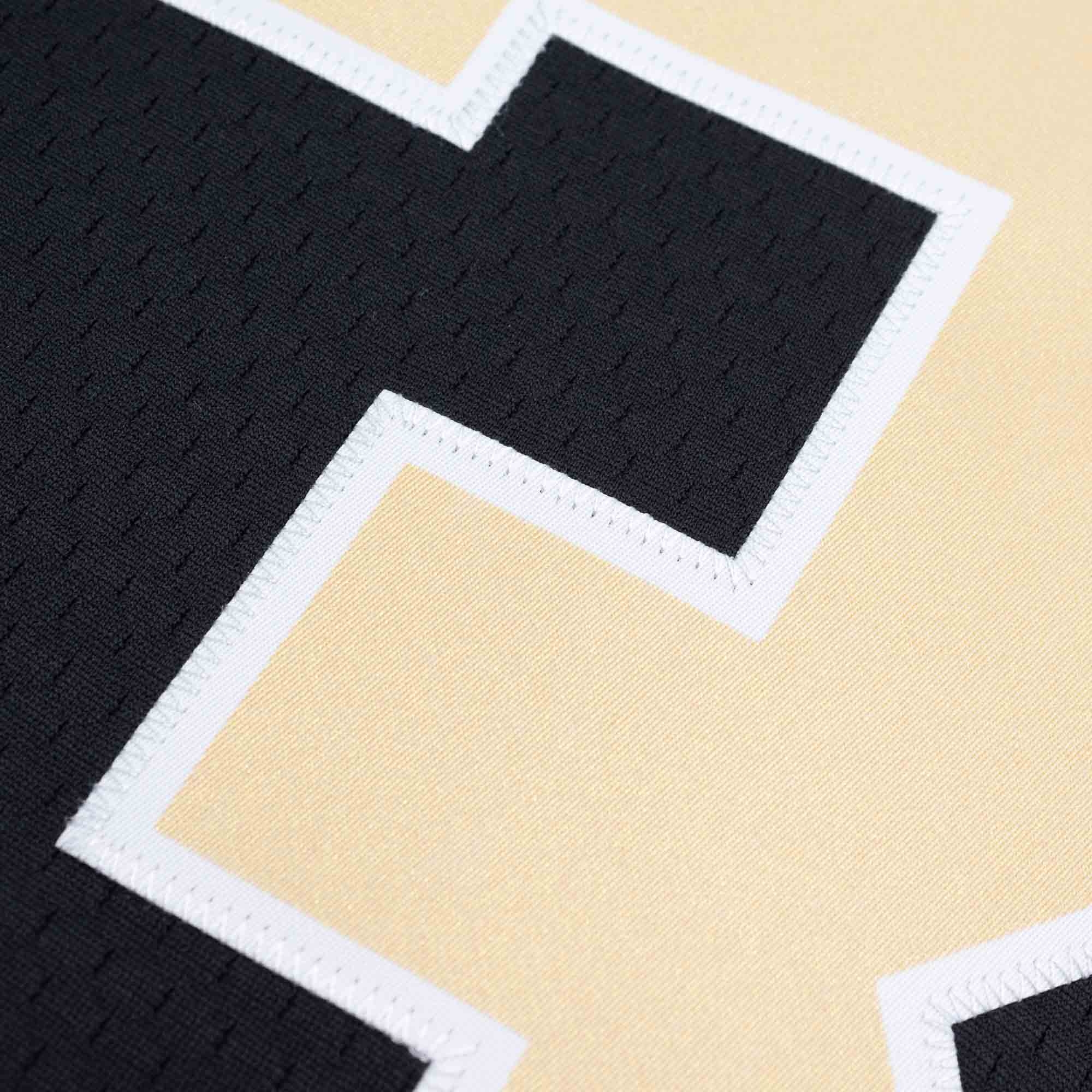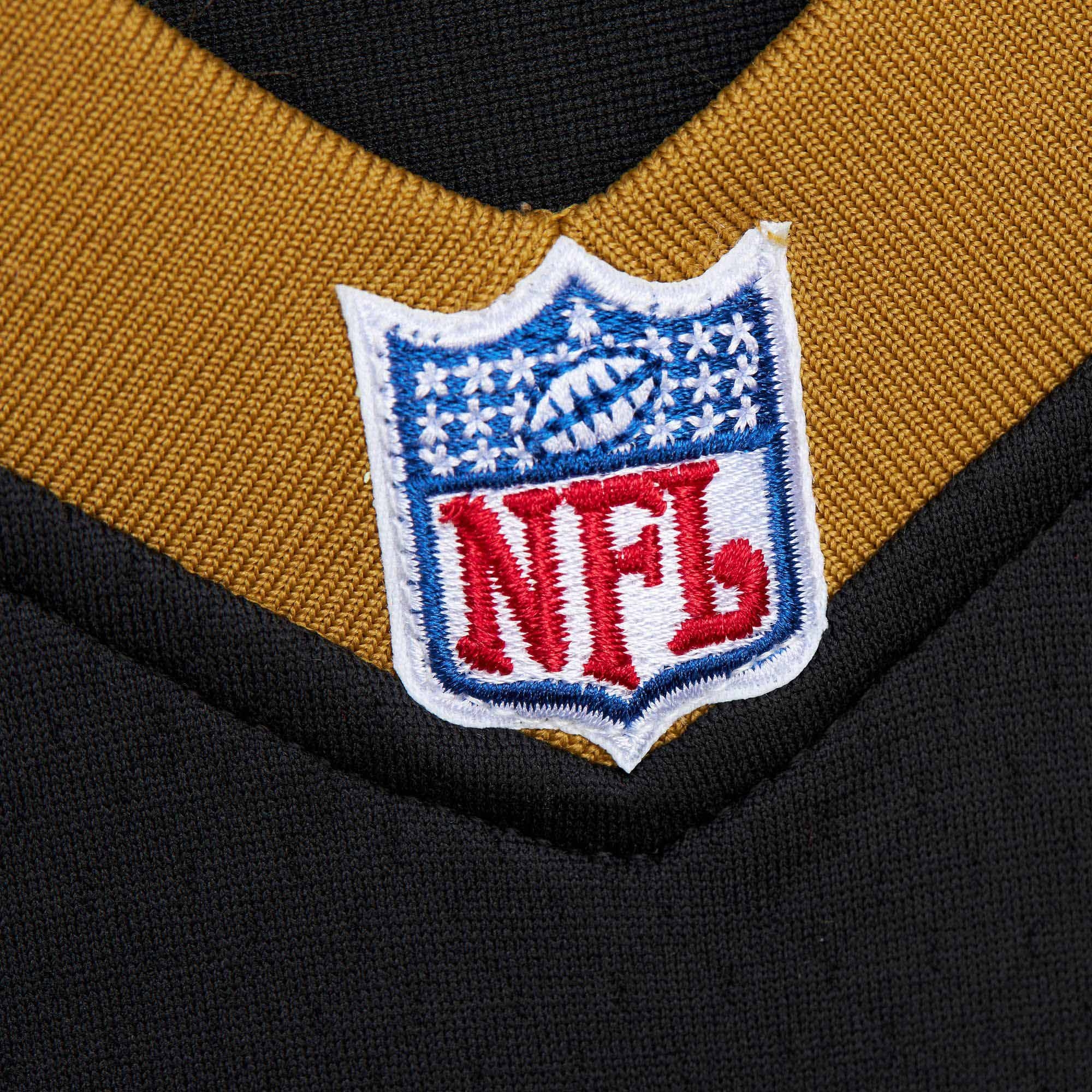 All numbers and letters are meticulously stitched, reflecting the official NFL design of the 1999 New Orleans Saints jerseys. The NFL Shield at the collar and the Mitchell & Ness label (Legacy Collection) at the hem emphasize the authenticity of this throwback jersey.
