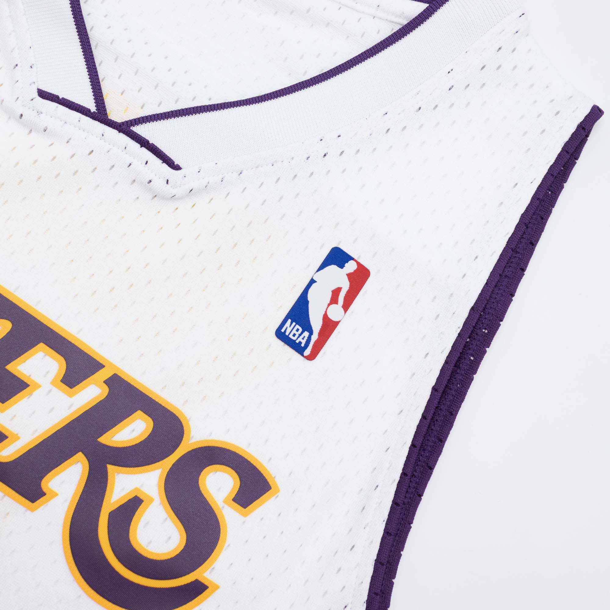 Rep your favorite team and player anytime in the NBA Swingman Hardwood Classics Jersey, replicating what the Los Angeles Lakers have worn on the court during that era. With heat seal screen printed twill logo, name and number applications. The body is made from 100% polyester mesh. Woven Hardwood Classics-Mitchell & Ness jocktag at front lower left.