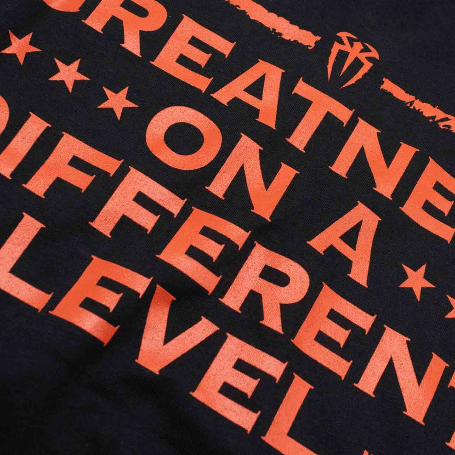 This officially licensed WWE T-shirt celebrates the superstar Roman Reigns. Featuring his unmistakable logo on the front and the phrase "Greatness on a Different Level" on the back, this T-shirt is perfect for all fans of the "Tribal Chief."