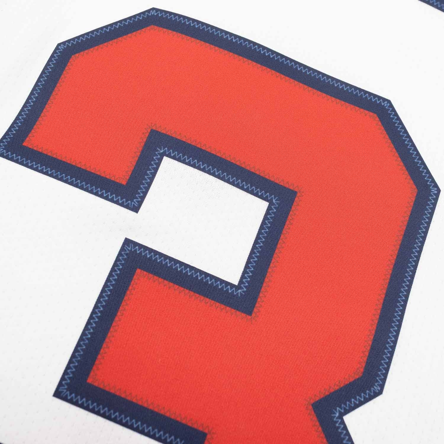 - Heat-applied twill name and number in official team styling.