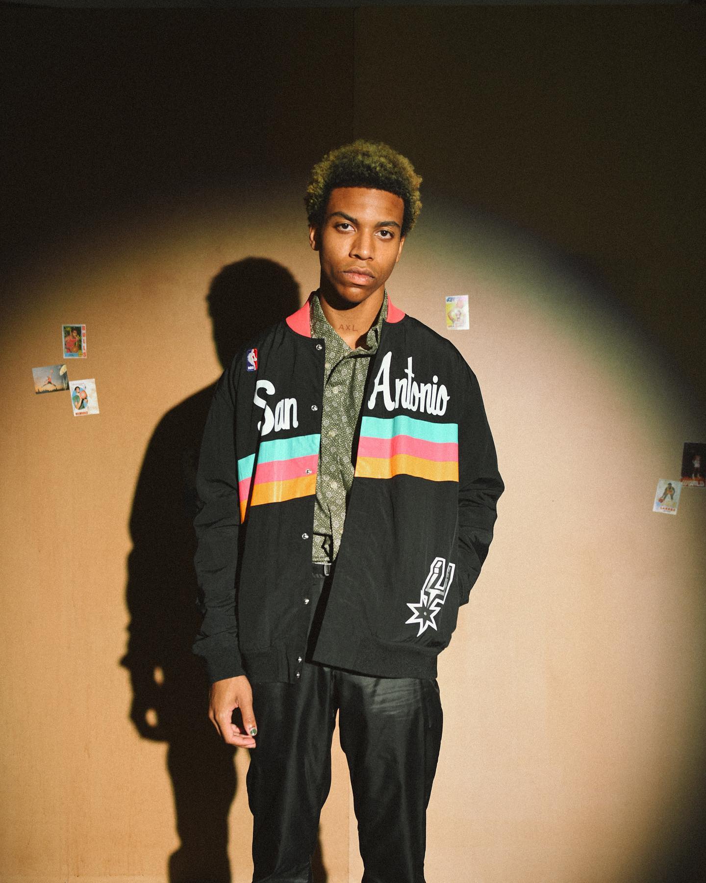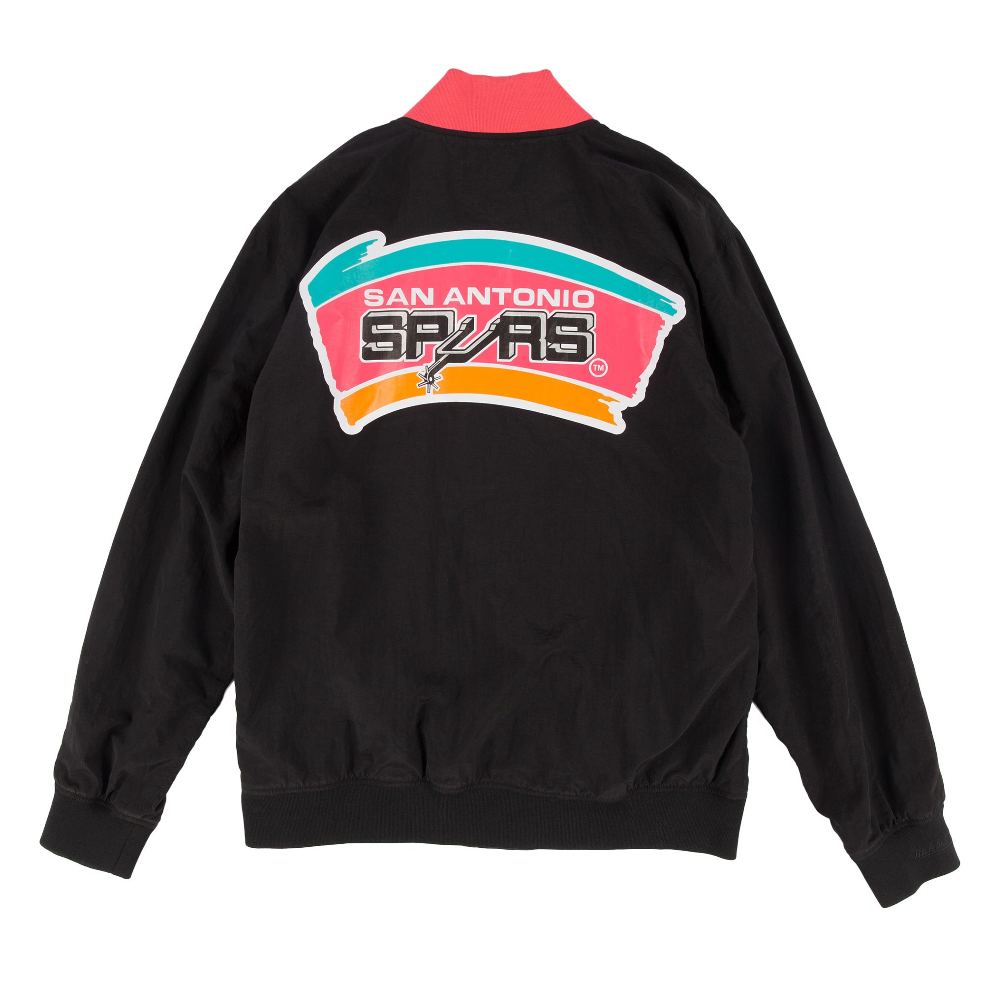 The basketball jacket features mesh lining to keep you cool and feeling fresh. An embroidered NBA league logo is found on the upper right chest, while the team name and year ID tag is sewn into the back waistband. Large San Antonio Spurs retro team graphics printed on back. San Antonio wordmark printed on front. Other features include 1×1 rib trim on the collar, sleeves and waistband, side pockets, as well as a center snap closure. Mitchell & Ness lettering embroidered on right cuff. This jacket is tailored fit, meaning it fits slimmer in the body.