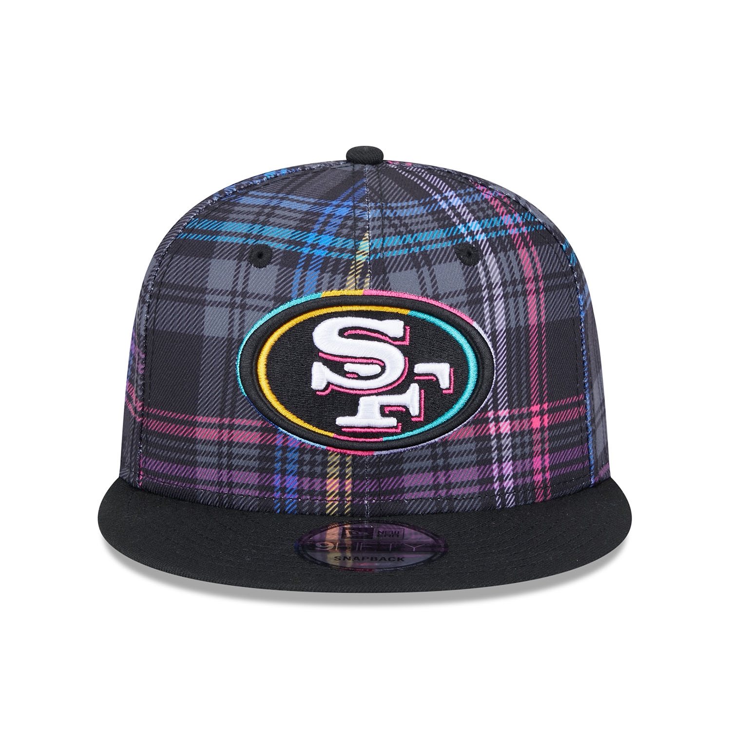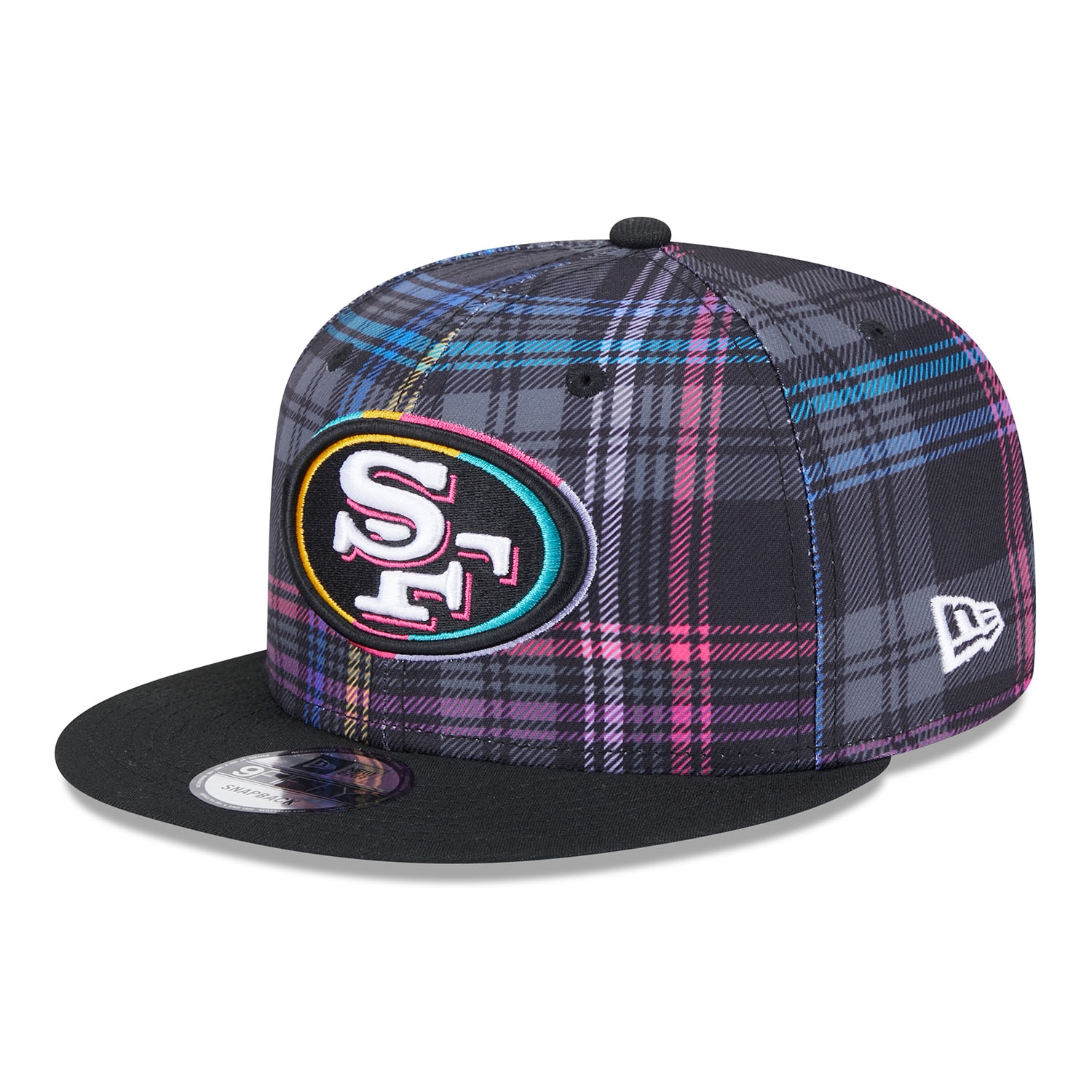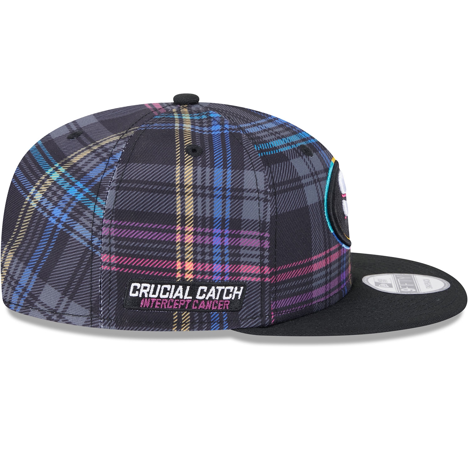 Support the global fight against cancer with the official New Era 2024 NFL Crucial Catch On-Field Cap. This adjustable fit NFL cap is worn on the sidelines during the 2024-25 Crucial Catch campaign in October. The front of the cap is embroidered with the brightly accented San Francisco 49ers team logo. The right side features the "CRUCIAL CATCH - INTERCEPT CANCER" patch, while the back is adorned with the embroidered NFL logo. The sublimated plaid design on all six panels in the signature Crucial Catch colors gives it a unique look.
