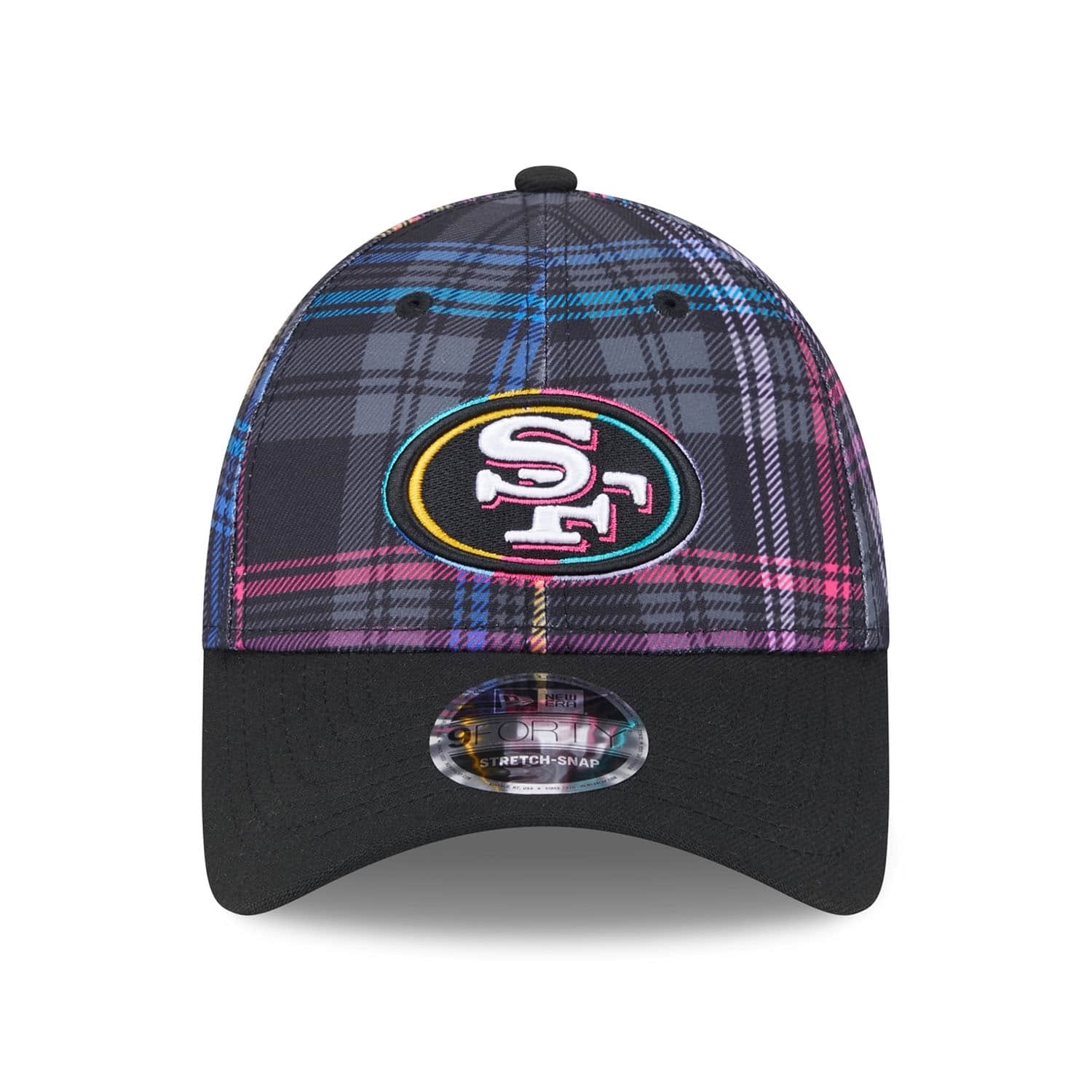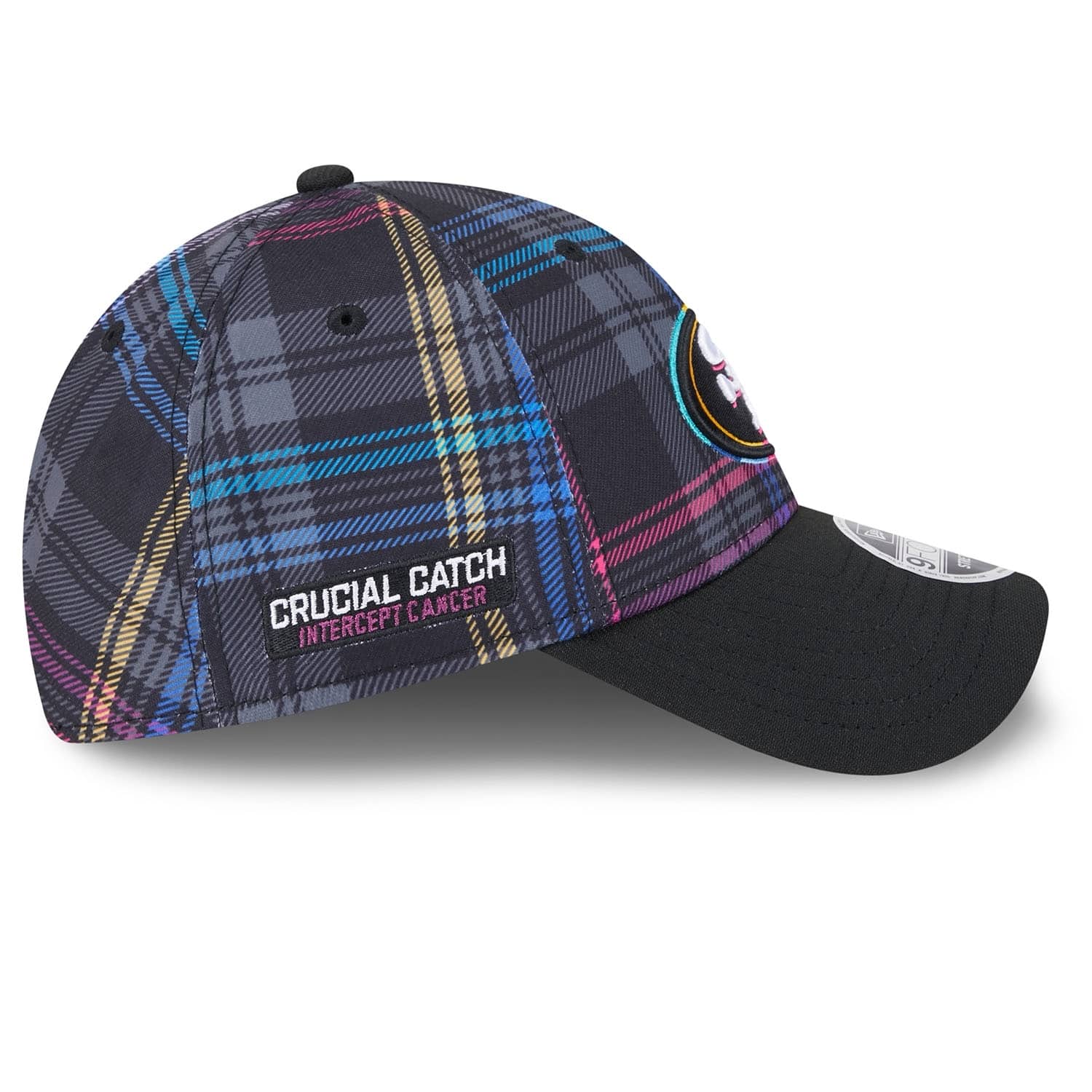 Support the global fight against cancer with the official New Era 2024 NFL Crucial Catch On-Field Cap. This adjustable fit NFL cap is worn on the sidelines during the 2024-25 Crucial Catch campaign in October. The front of the cap is embroidered with the brightly accented San Francisco 49ers team logo. The right side features the "CRUCIAL CATCH - INTERCEPT CANCER" patch, while the back is adorned with the embroidered NFL logo. The sublimated plaid design on all six panels in the signature Crucial Catch colors gives it a unique look.