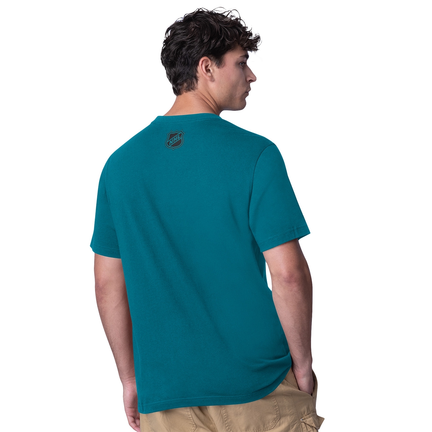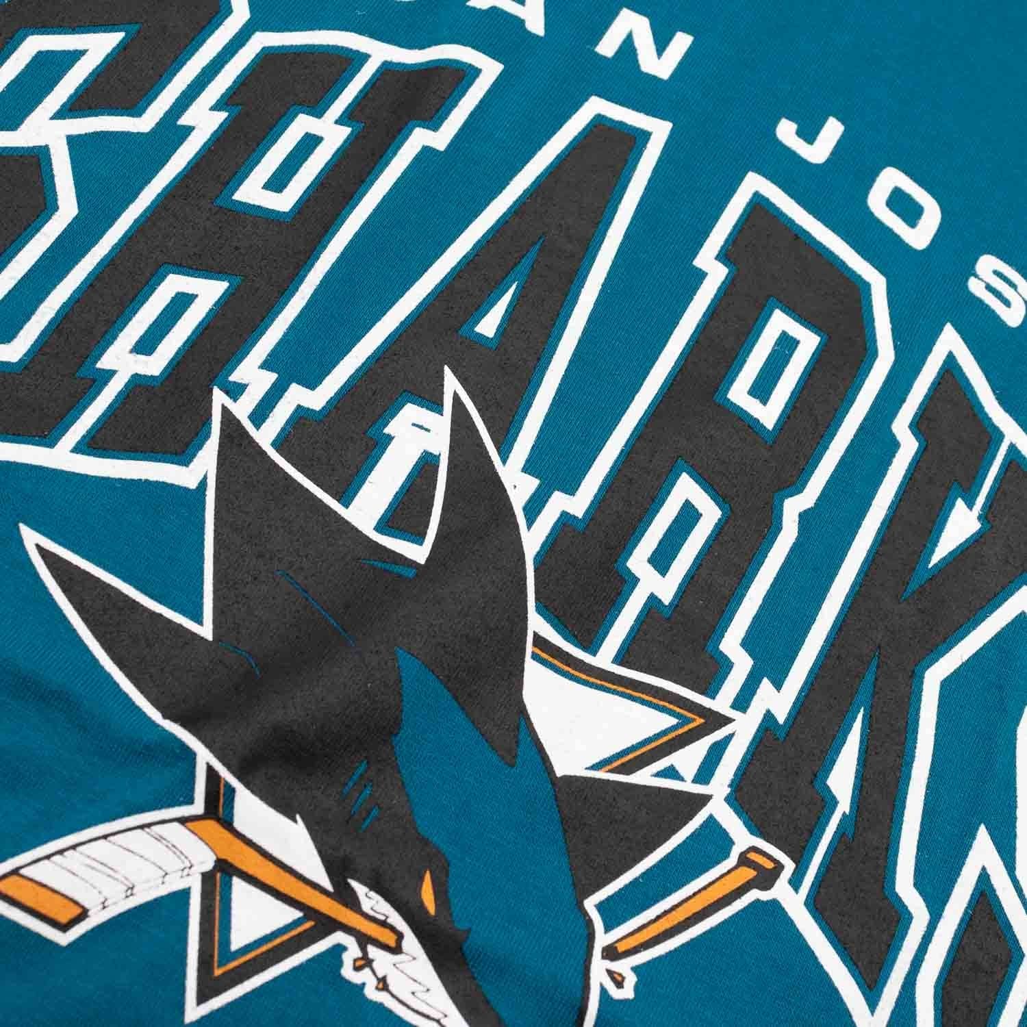 - Team-Centric Design: The front chest showcases a bold screen-printed "San Jose Sharks" graphic with the iconic team logo, while the back neck is adorned with the NHL shield for added flair.