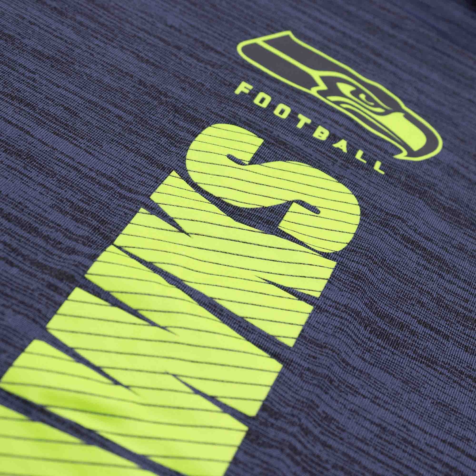 It features a large Seattle Seahawks front print, the NFL Sideline Shield logo on the right sleeve, and the Nike Swoosh on the left. Made from lightweight and soft 100% performance polyester for optimal comfort.