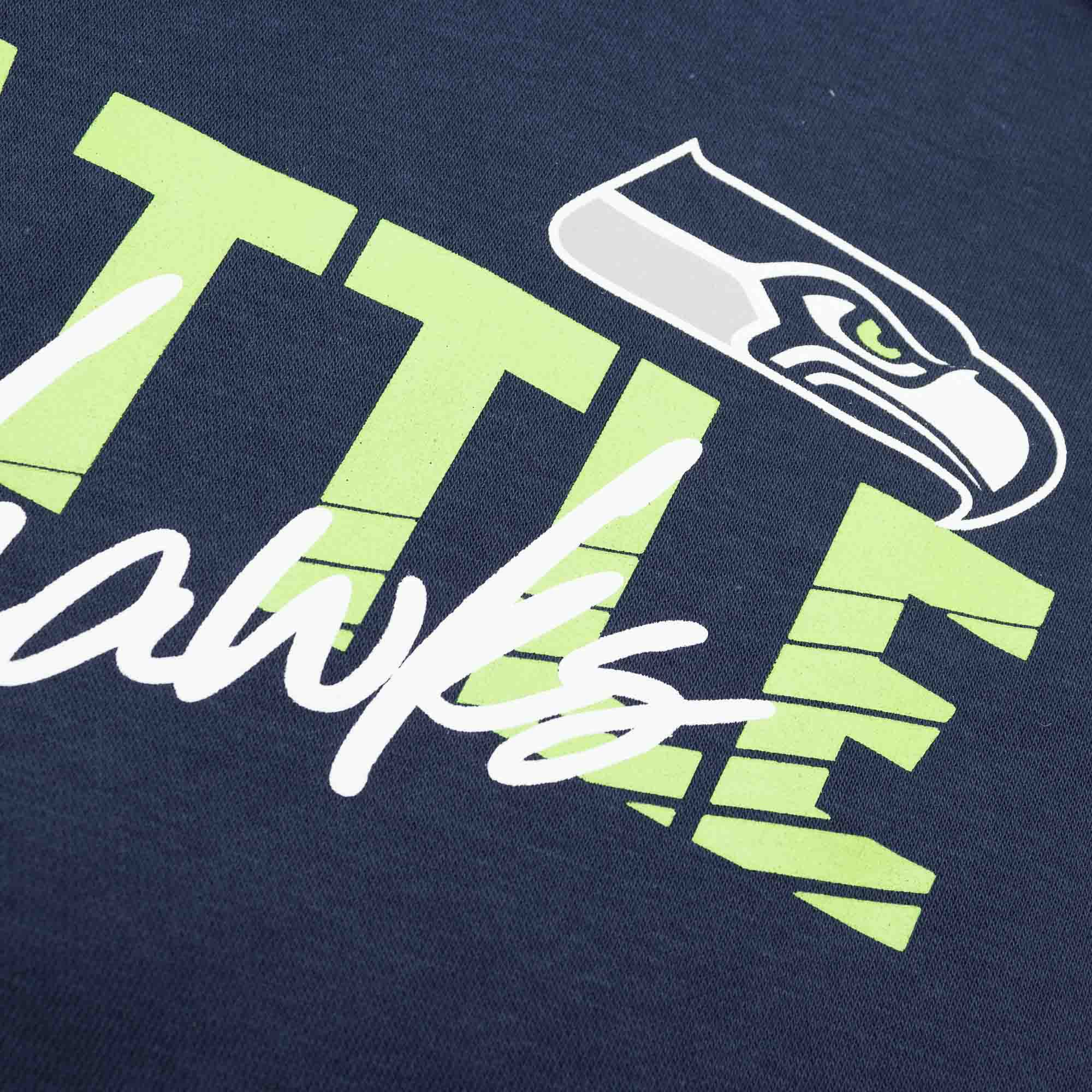 This Nike NFL sweater comes in the official team colors and features a beautiful Seattle Seahawks wordmark logo front print. With Nike Swoosh logo on left sleeve.