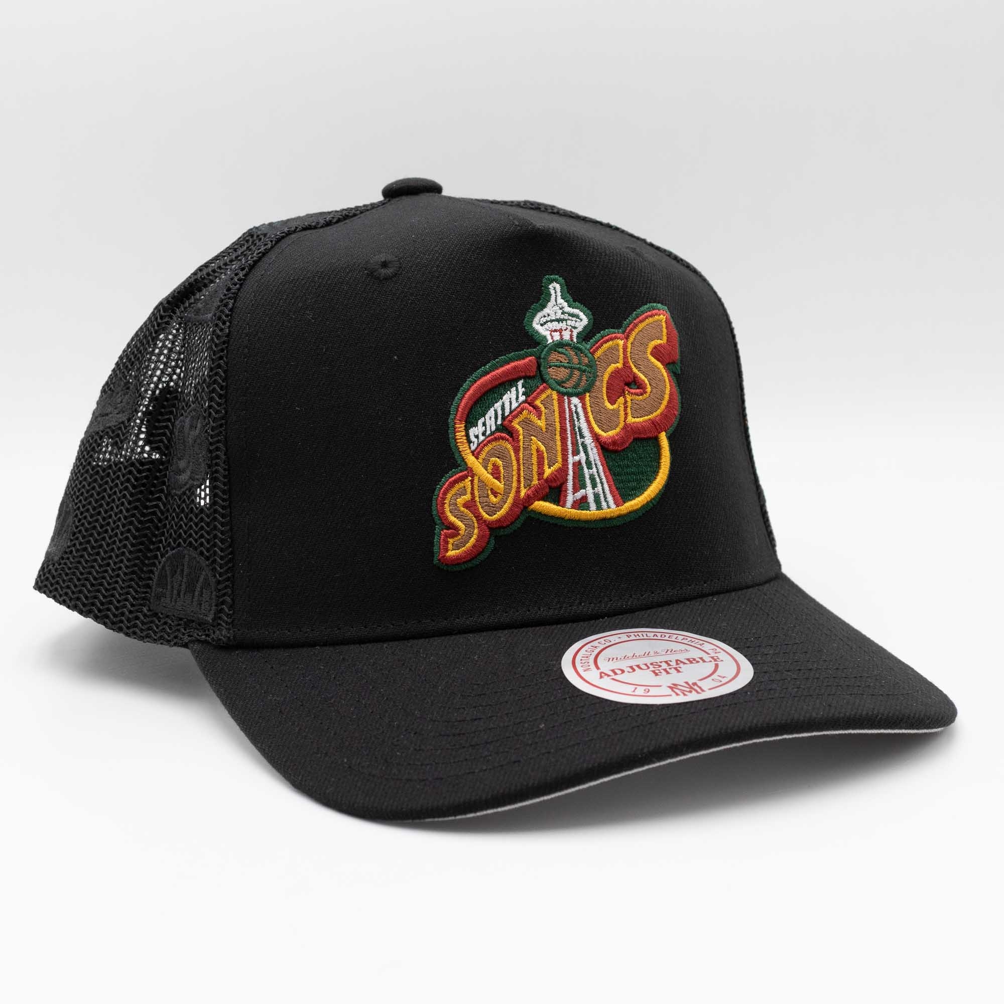 Mitchell & Ness NBA Black Monogram Adjustable Fit Trucker Cap from your Seattle Supersonics.
