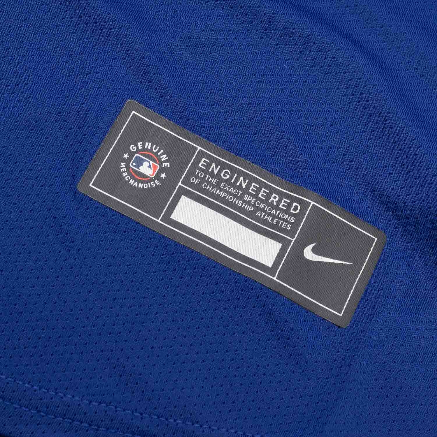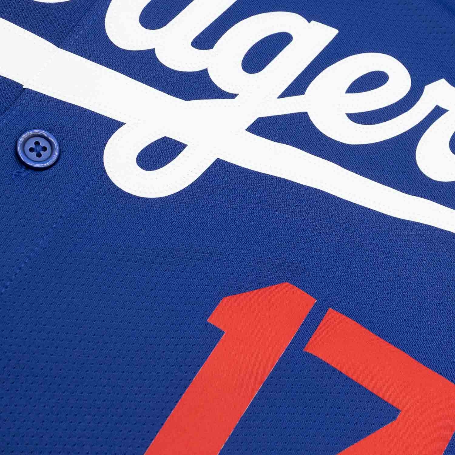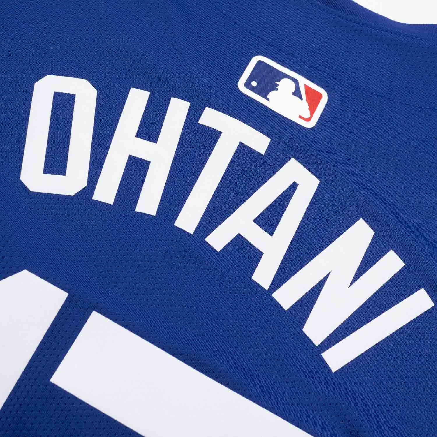 Inspired by the on-field uniforms of your favorite MLB squad, this Los Angeles Dodgers Jersey delivers an authentic look with twill details. The sweat-wicking, double-knit mesh fabric helps provide a breathable, comfortable feel on game day. Official heat-sealed twill Los Angeles Dodgers wordmark logo with zigzag stitching on front. Embroidered Nike Swoosh logo. Sublimated team logo sleeve patch. Heat-applied woven MLB Batterman on back and Nike jock tag at front hem. With official name and number decoration of #17 Shohei Ohtani.