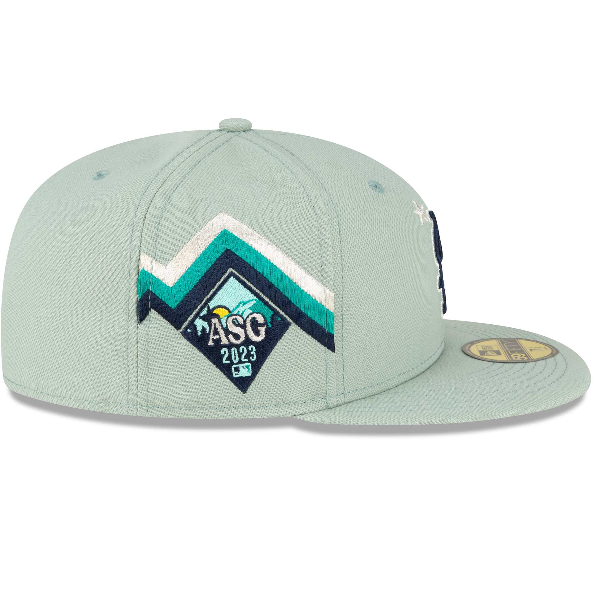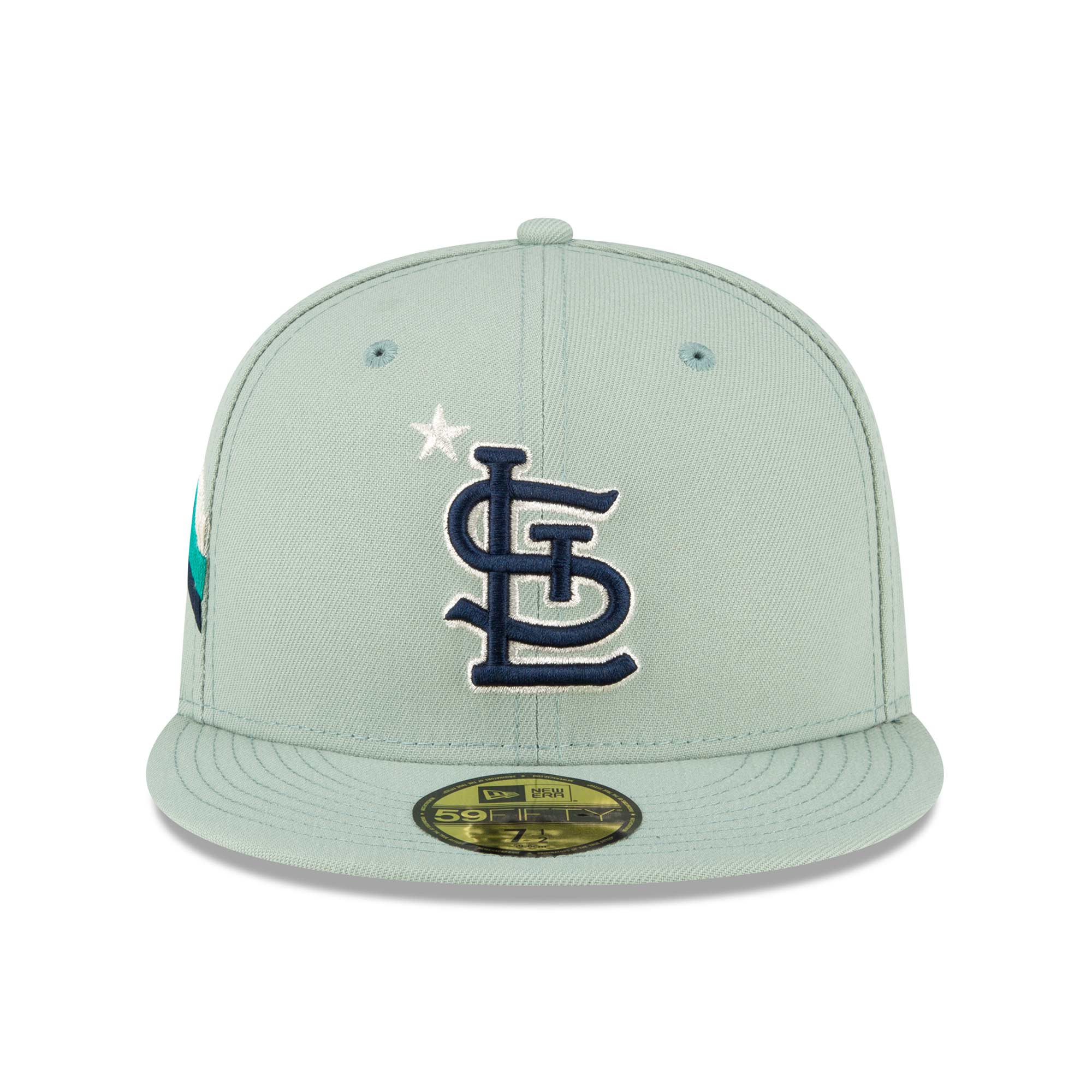 The mint green 2023 MLB All-Star Game Fitted Cap celebrates Seattle with its special color scheme and provides unique team support. The front of the cap is decorated with a two-tone St. Louis Cardinals team logo in a silver-blue look. The back features the MLB Batterman logo. The right side of the cap is embroidered with the 2023 ASG logo and dynamic stripes. The underside of the visor is navy blue.