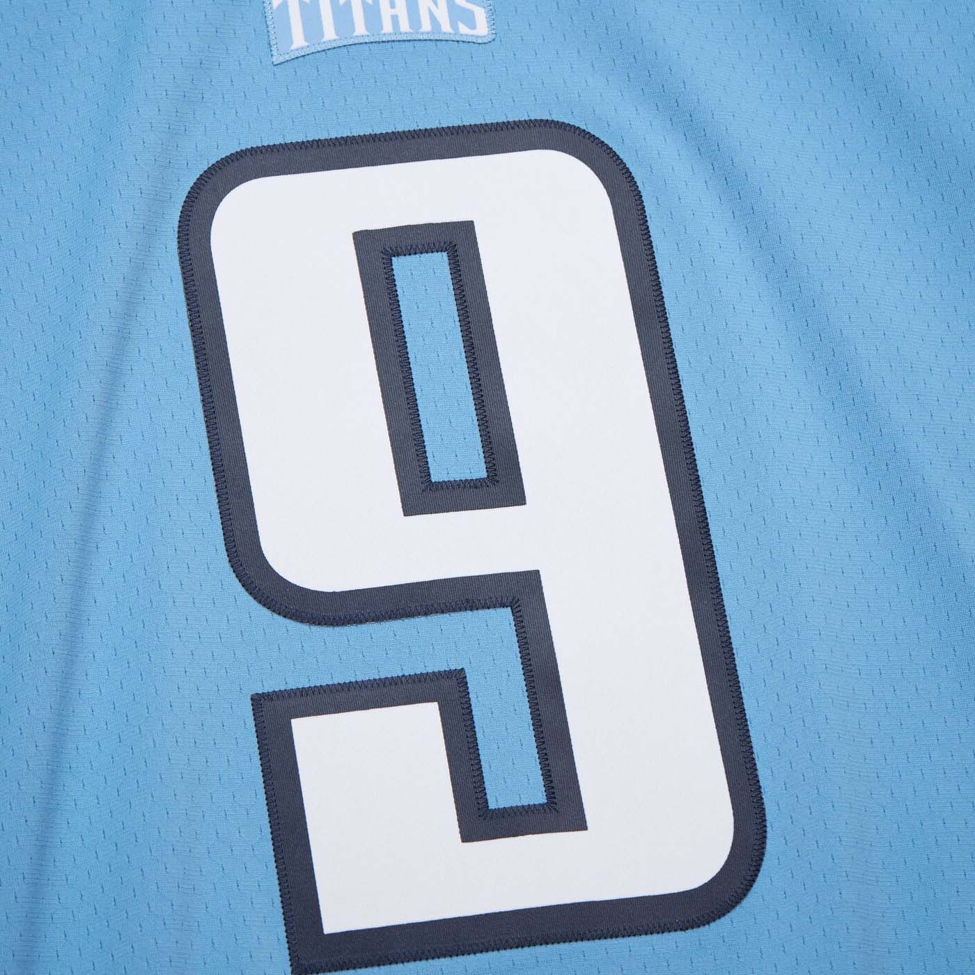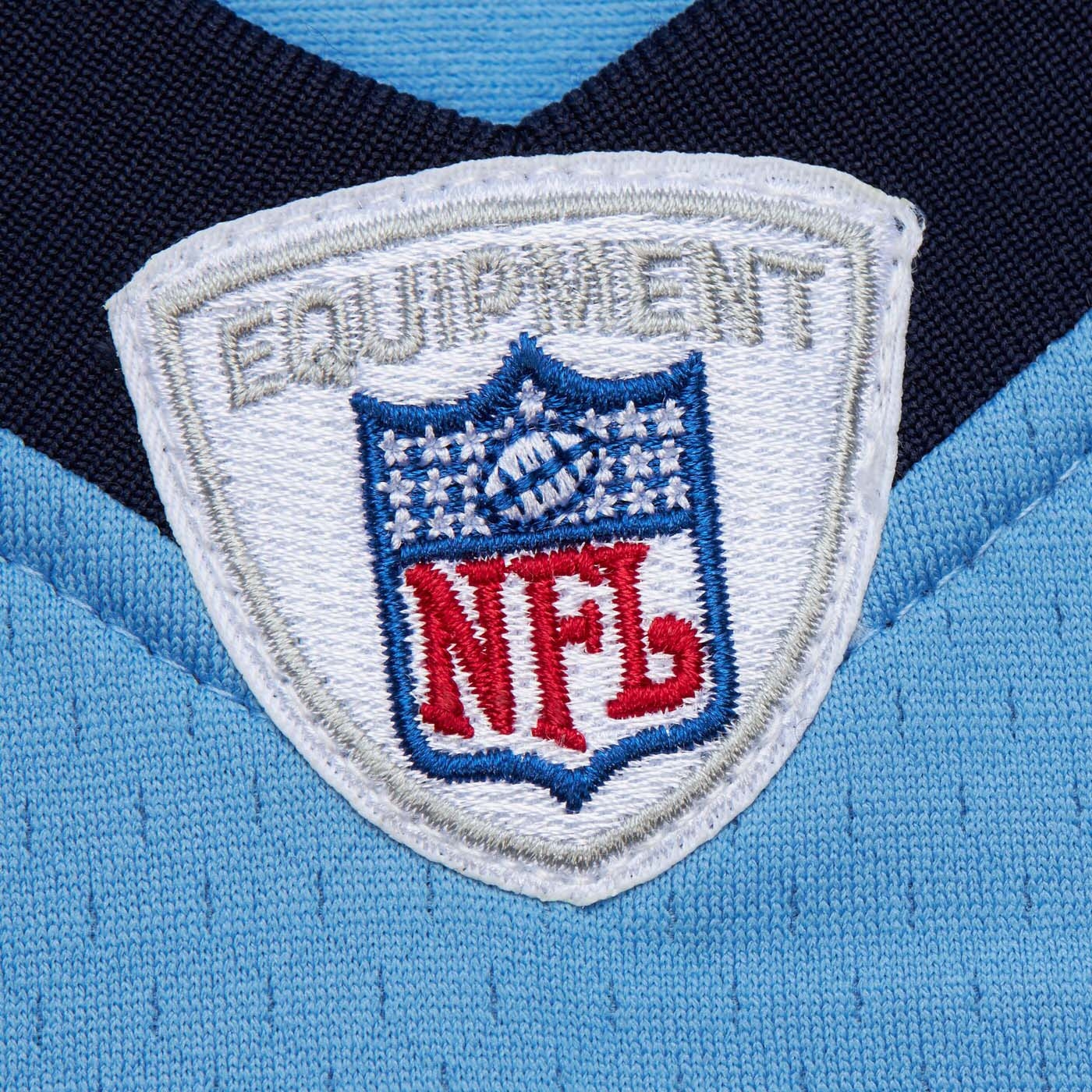 All numbers and letters are stitched with high-quality craftsmanship, and the design elements match the official NFL design of the Tennessee Titans from 2003. The NFL logo is stitched on the collar, and the Mitchell & Ness Legacy Collection label is located on the hem.