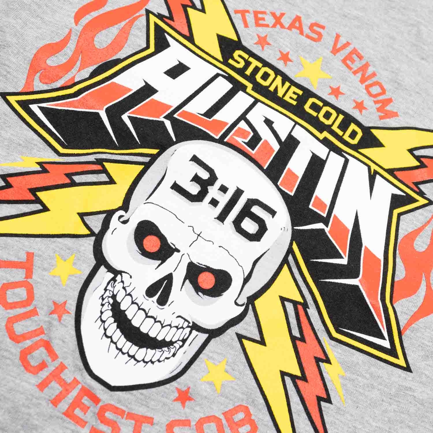 This officially licensed WWE T-shirt pays tribute to the legendary Stone Cold Steve Austin, the "Texas Rattlesnake." Featuring the iconic "Austin 3:16" skull design with bold graphics, lightning bolts, and flames, this shirt embodies the toughness and rebellious spirit of one of WWE's greatest icons.