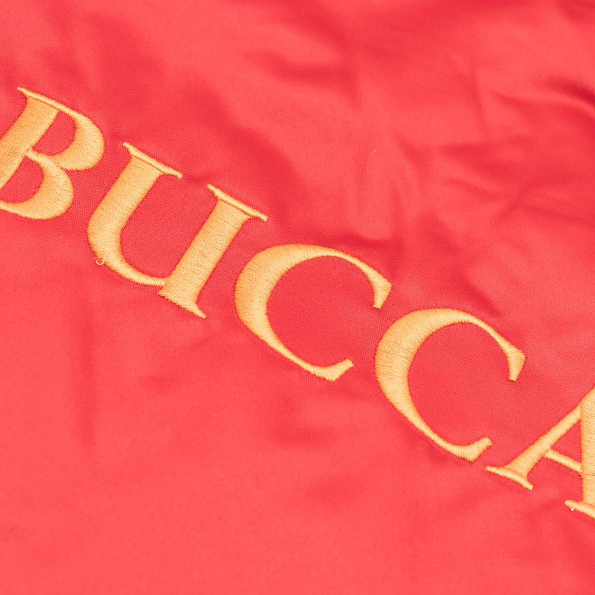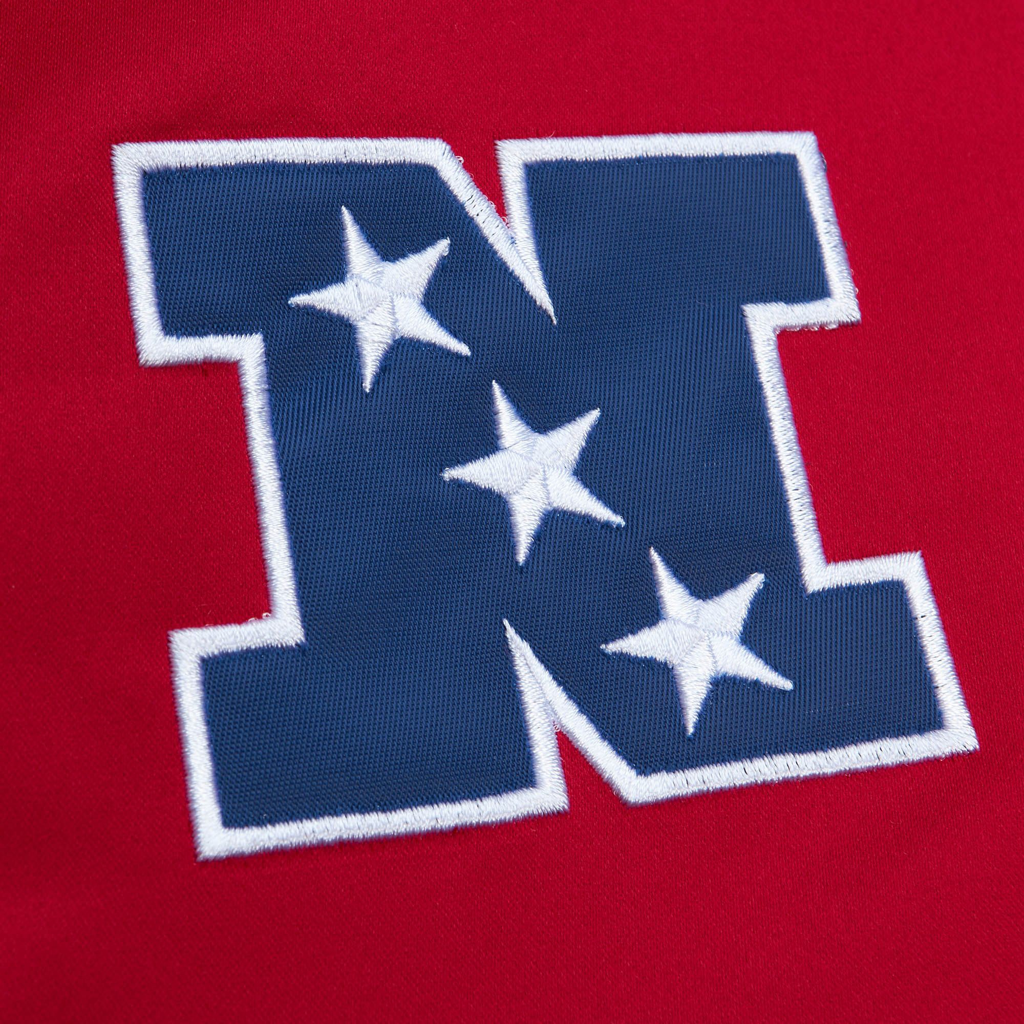 This heavyweight NFL satin jacket features Tampa Bay Buccaneers classic team logo and conference logo embroidery on front. Mitchell & Ness logo embroidered on right sleeve cuff. Contrast color self-fabric taping on sleeves.