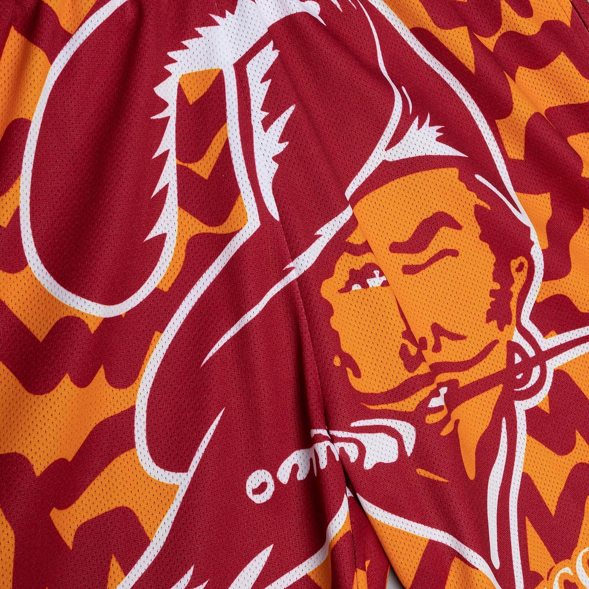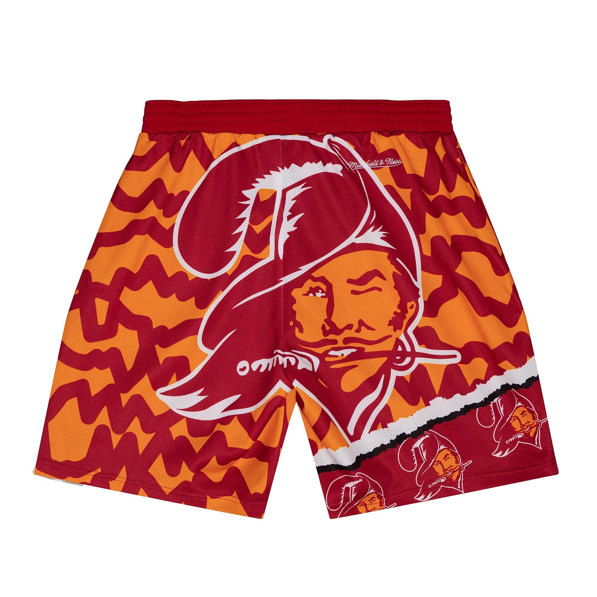 These Mitchell & Ness NFL Jumbotron 2.0 shorts feature a knit rib waistband, cotton drawstring and two side pockets. This 100% polyester mesh short is a must-have with classic Tampa Bay Buccaneers team logo and wordmark sublimation print. Great all-over summer style reminiscent of classic 90s beach shorts. These NFL football shorts match the Mitchell & Ness Basketball Swingman shorts in quality and style.