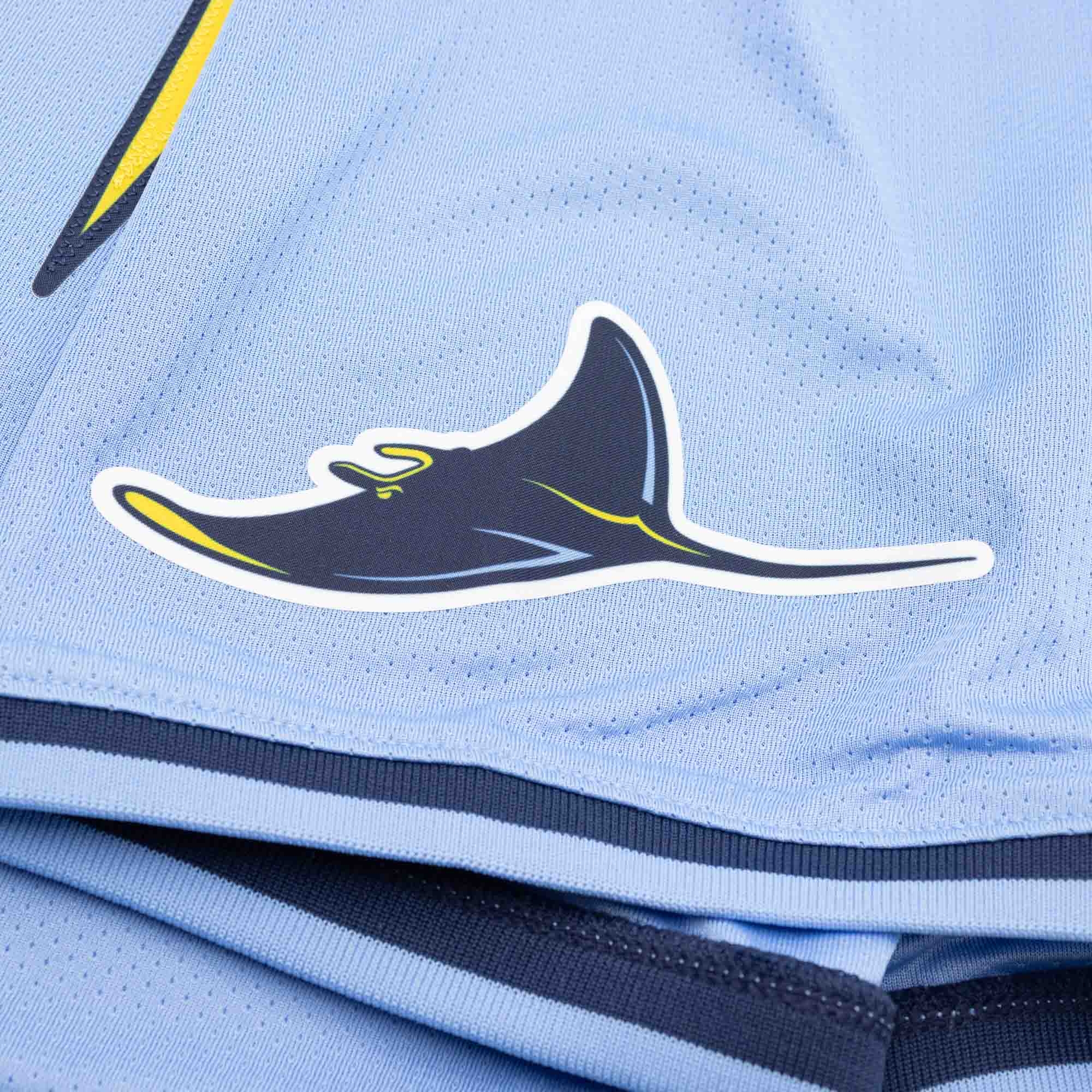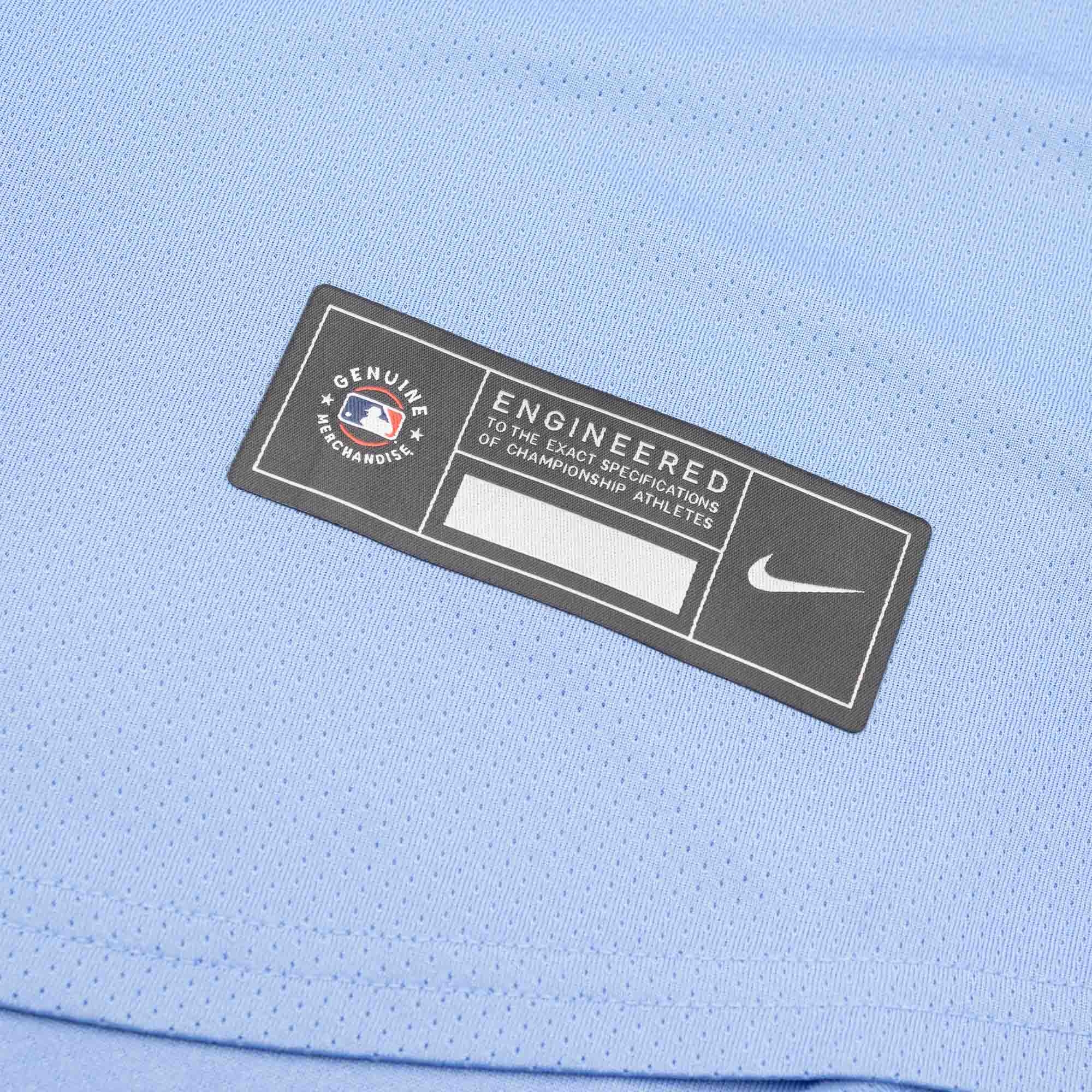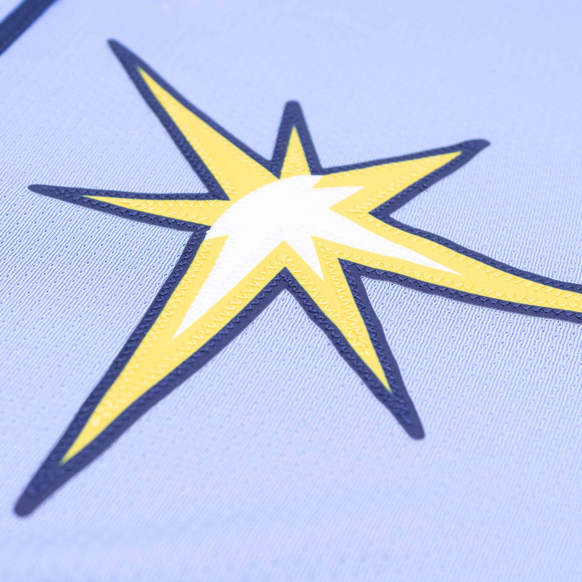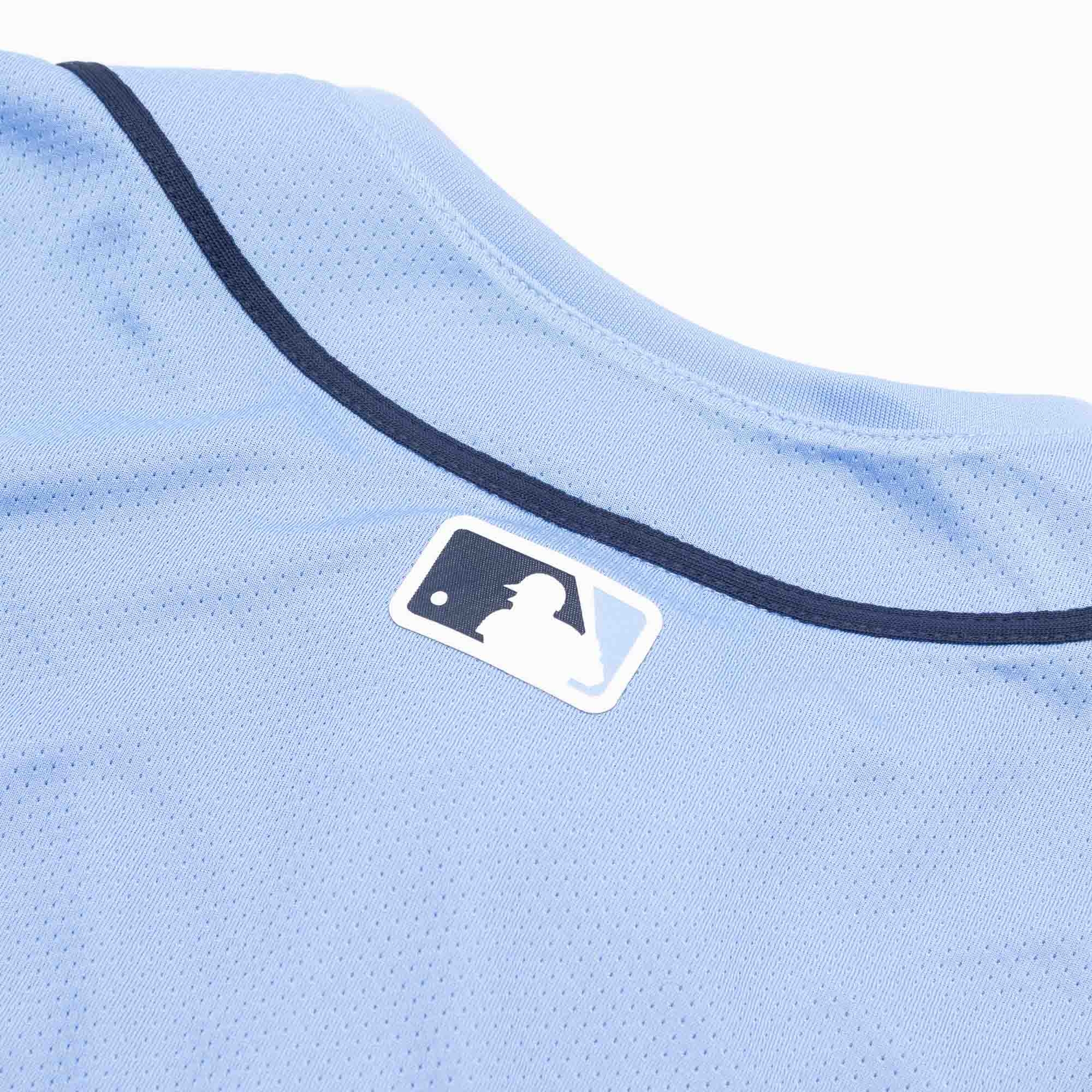 Inspired by the on-field uniforms of your favorite MLB squad, this Tampa Bay Rays Jersey delivers an authentic look with twill details. The sweat-wicking, double-knit mesh fabric helps provide a breathable, comfortable feel on game day. Official heat-sealed twill Tampa Bay Rays wordmark logo with zigzag stitching on front. Embroidered Nike Swoosh logo. Sublimated team logo sleeve patch. Heat-applied woven MLB Batterman on back and Nike jock tag at front hem.